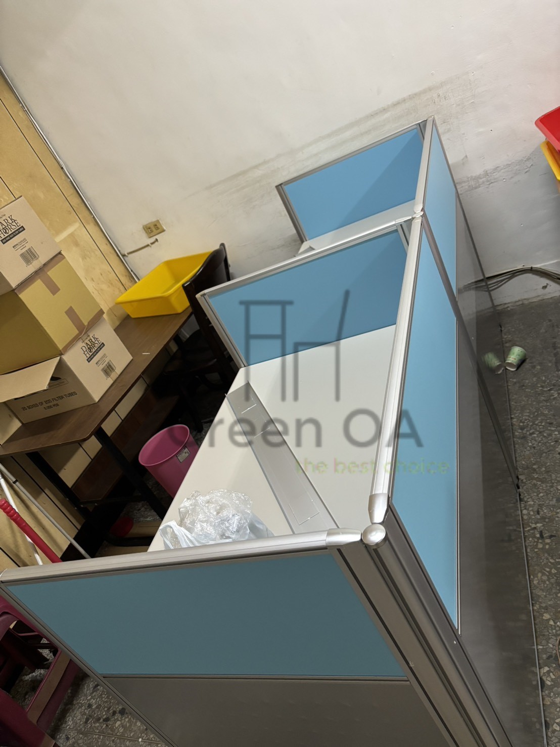 此次案例採用 2.5 屏風(102 高)+主桌+ABS 中抽+職員椅 的實用配置,著重於工作效率與舒適度的平衡。102 公分高的屏風在提供基本區隔的同時,保留良好通透感,讓空間不顯壓迫;主桌搭配 ABS 中抽,方便收納常用文具與文件,提升日常作業流暢度。職員椅則兼顧支撐性與久坐舒適度,適合長時間使用。整體配置簡潔有序,充分展現 Green OA 對實際辦公需求與空間配置效率的精準掌握。