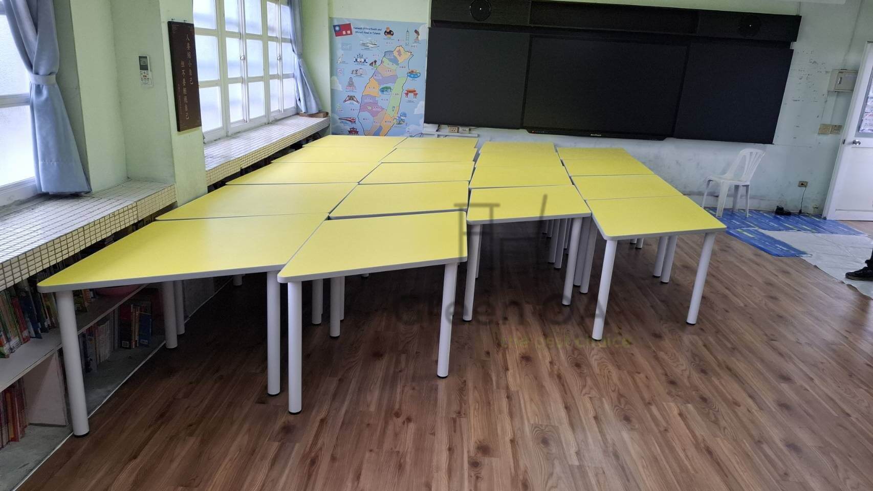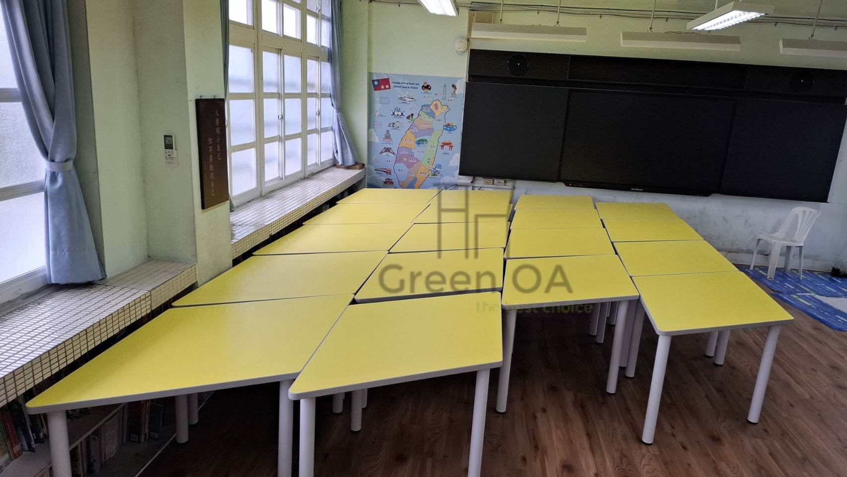 明亮活潑的空間配置以 菱形桌 為核心,透過可自由拼接的多邊形桌面,讓教室布局更具彈性,不論是小組討論、團隊合作、U 型或圓形圍坐,都能快速變換形成最合適的學習動線。桌面採用亮彩耐磨材質,搭配穩固的鋼管桌腳,兼顧美觀與耐用性,特別適合學校教室、圖書室、多功能學習教室使用。此組 拼接菱形桌 的設計,不僅提升視覺活力,也強化學生互動,充分展現 Green OA 在教育空間家具規劃上的專業與彈性。