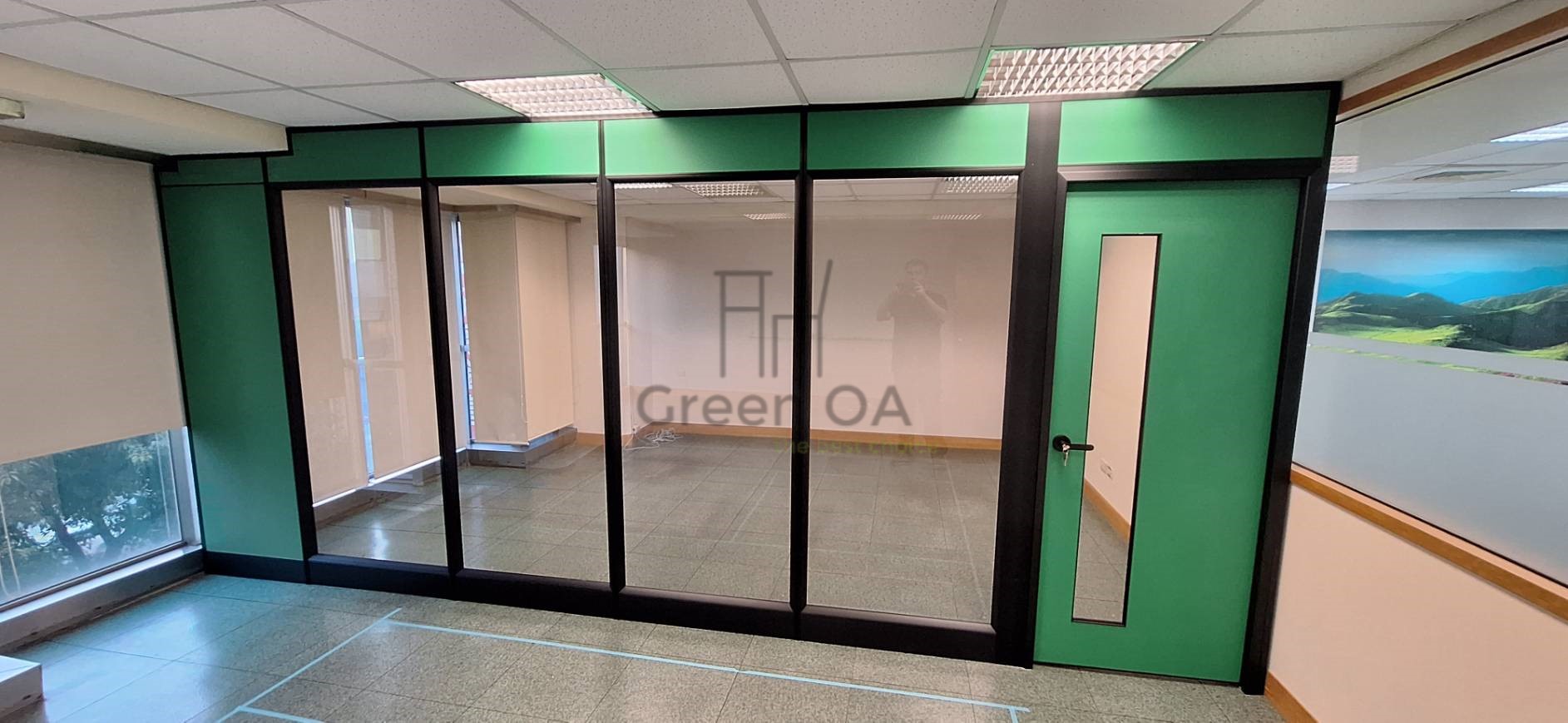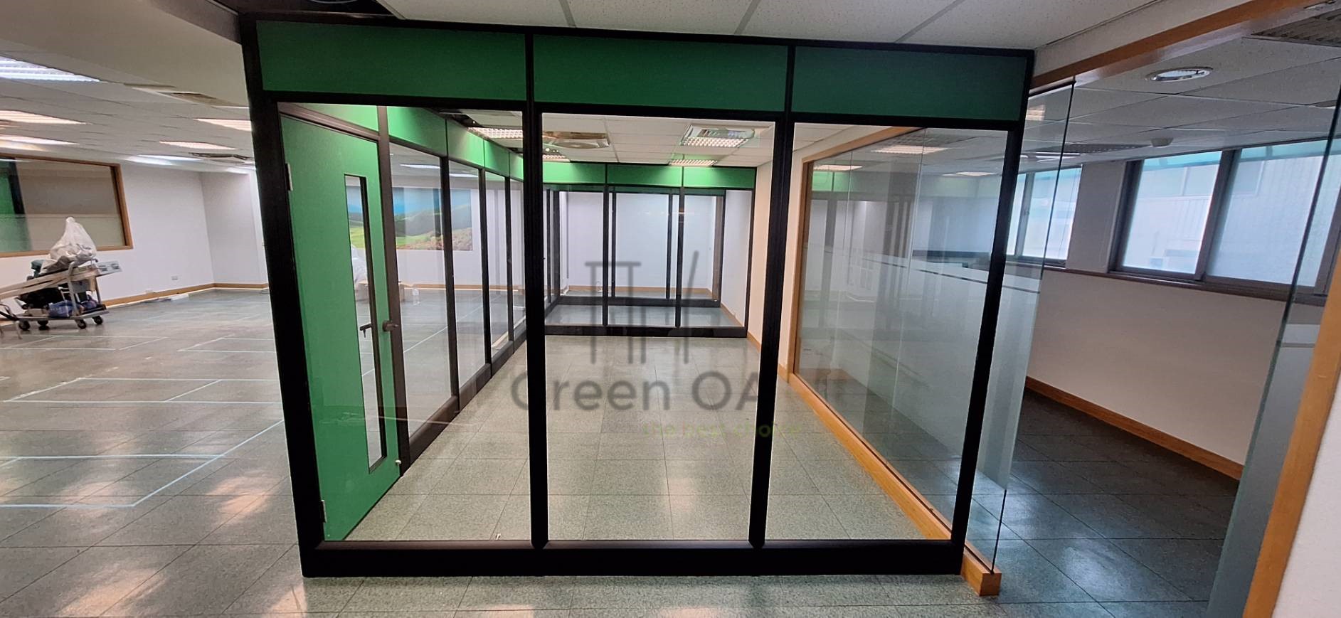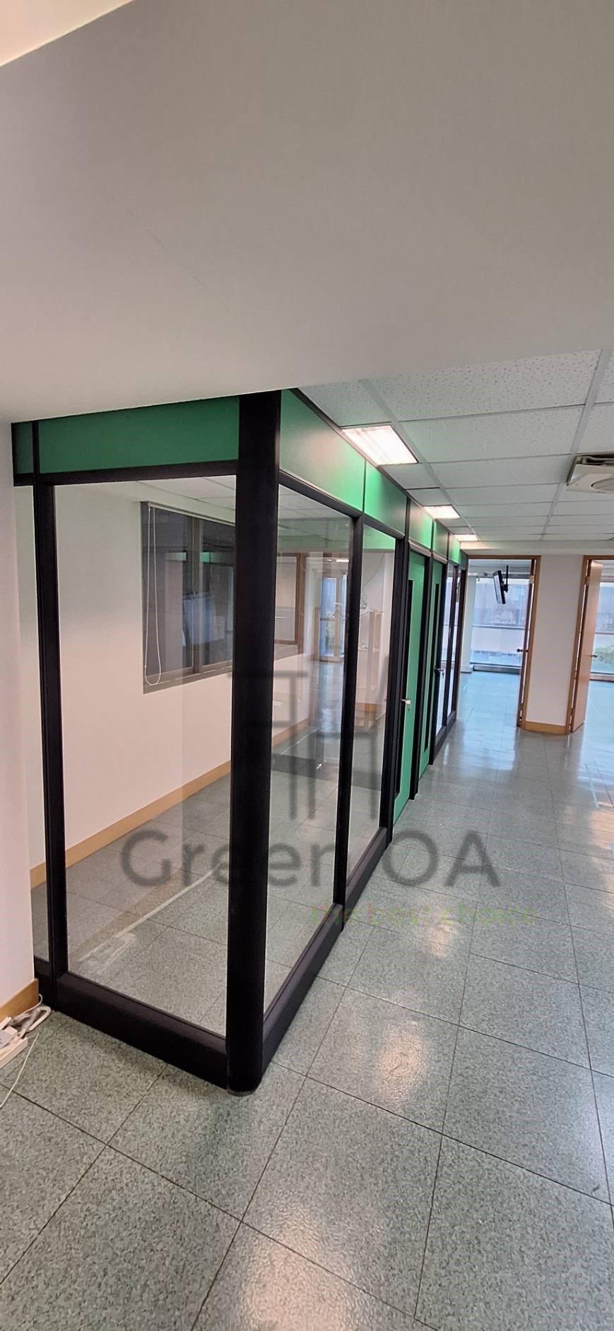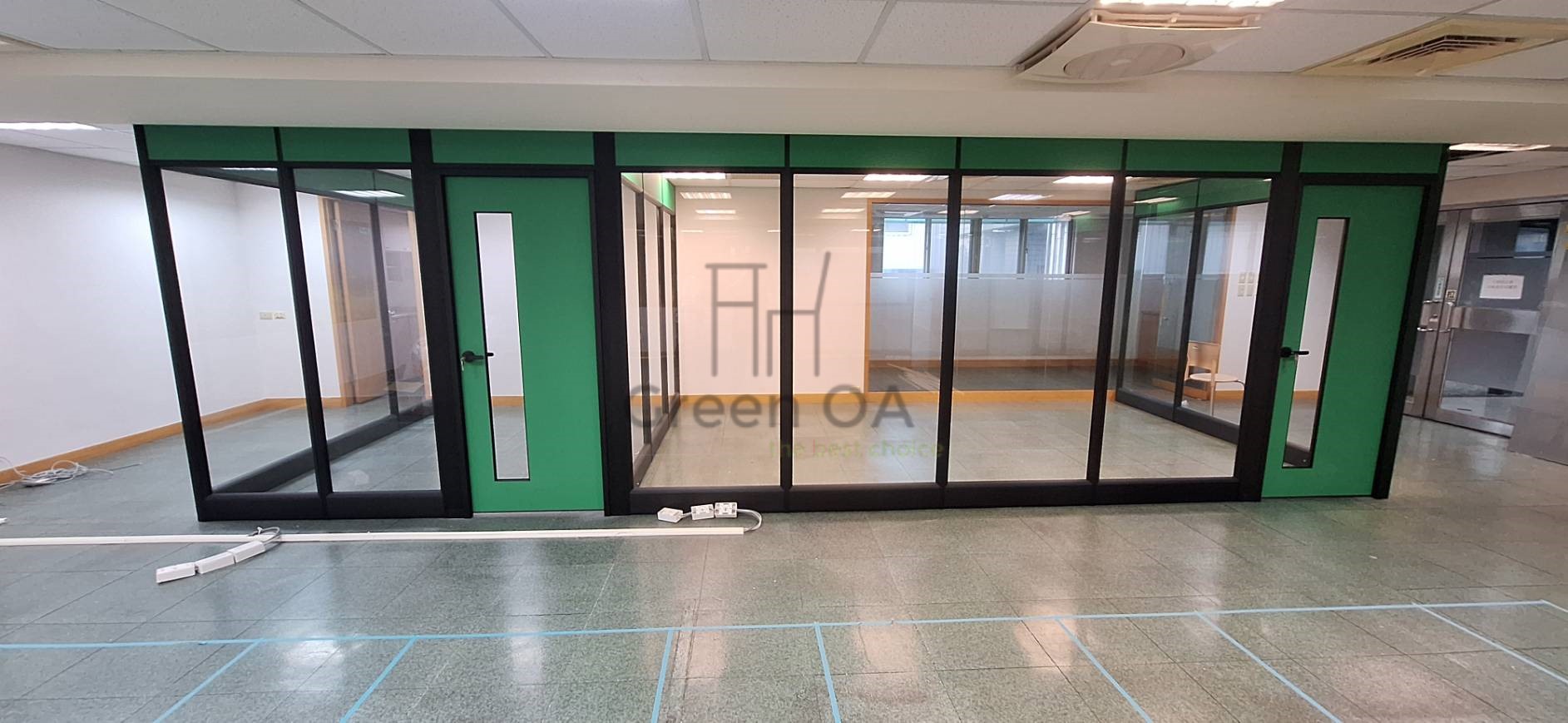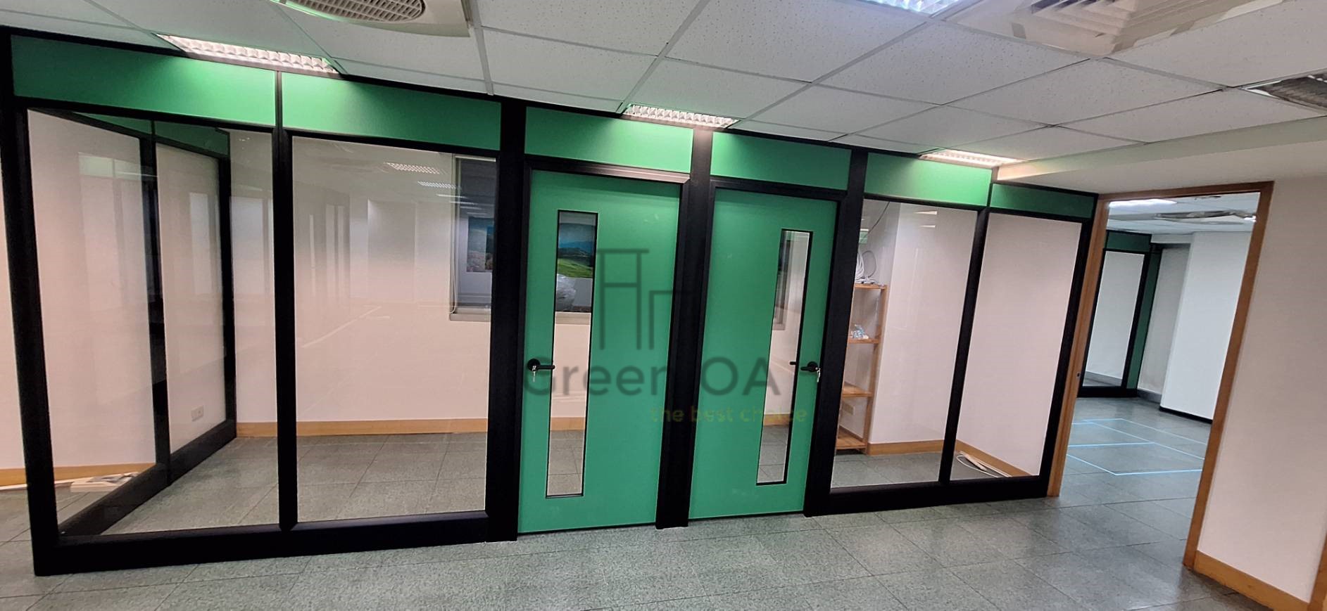 本案採用高隔間配置,結合玻璃與實體隔間設計,清楚劃分辦公空間機能,同時保留良好採光與通透感。隔間結構穩固,線條俐落,能有效區隔不同部門或獨立辦公室,降低噪音干擾,提升整體工作專注度。玻璃隔間讓走道視覺延伸不顯壓迫,也有助於空間管理與動線規劃。整體設計兼顧實用性與現代感,適合行政單位、企業辦公室及多間隔需求的空間使用。