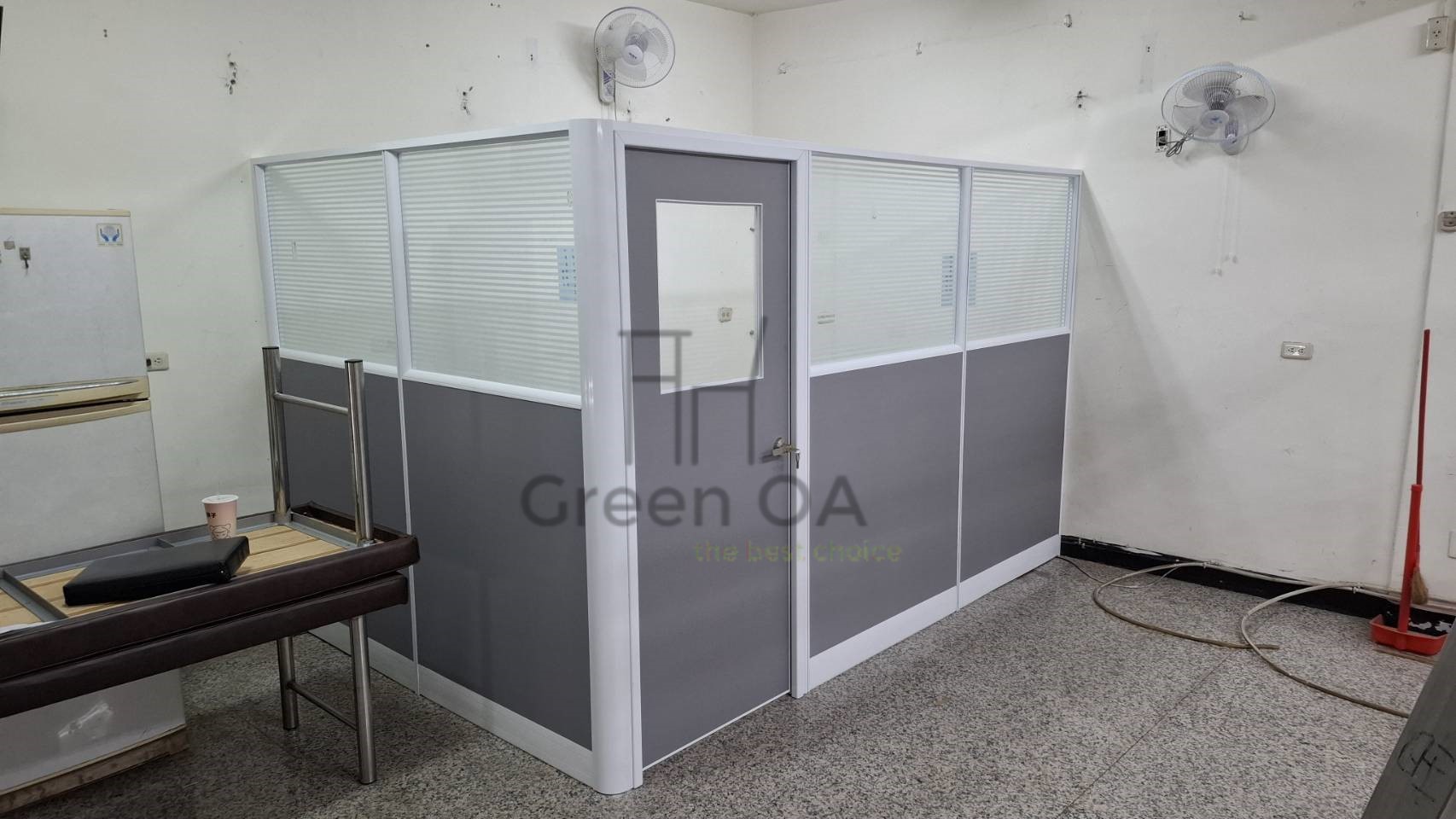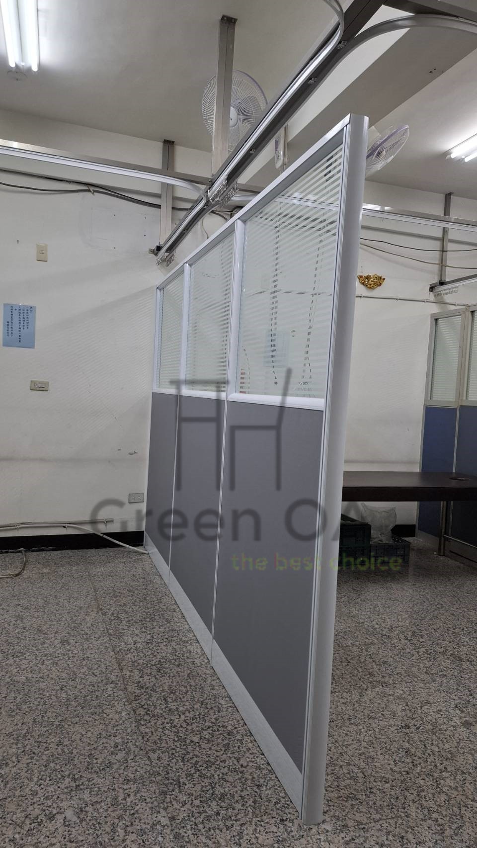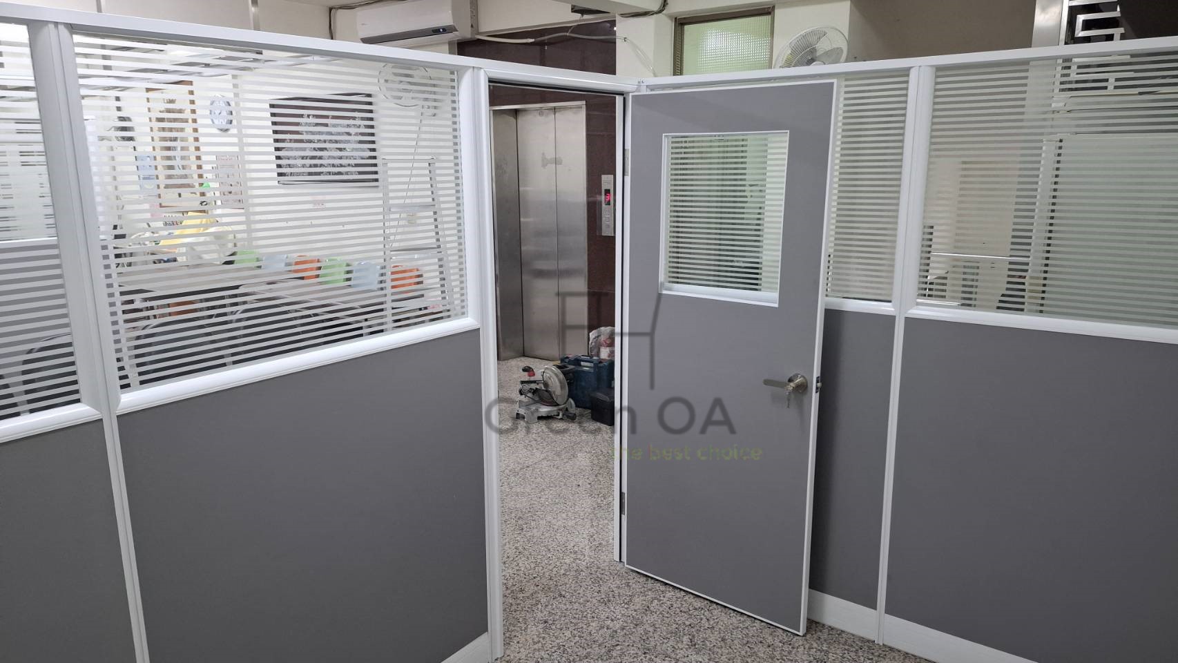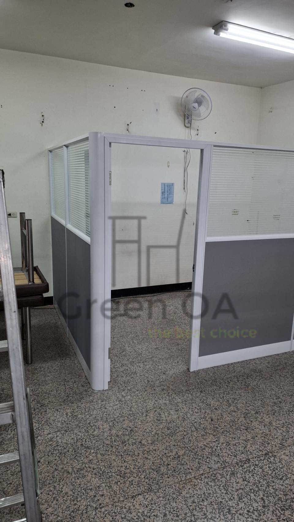 本次案例採用高隔間配置,清楚界定辦公空間動線,同時兼顧隱私與採光需求。隔間上方運用透明玻璃與百葉設計,在維持視覺穿透感的同時,也能依需求調整遮蔽程度,讓空間不顯封閉。下方實體隔板則強化穩定性與專業感,適合行政或獨立作業區使用。整體施工俐落、線條簡潔,使既有空間迅速轉化為有秩序的辦公環境,展現 Green OA 在高隔間規劃與現場整合上的成熟經驗。