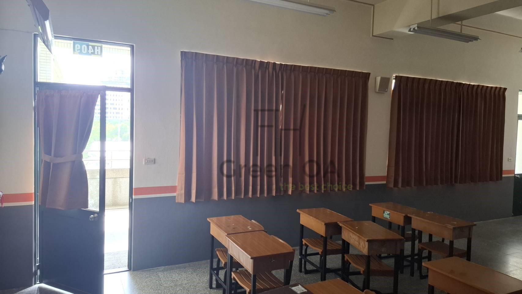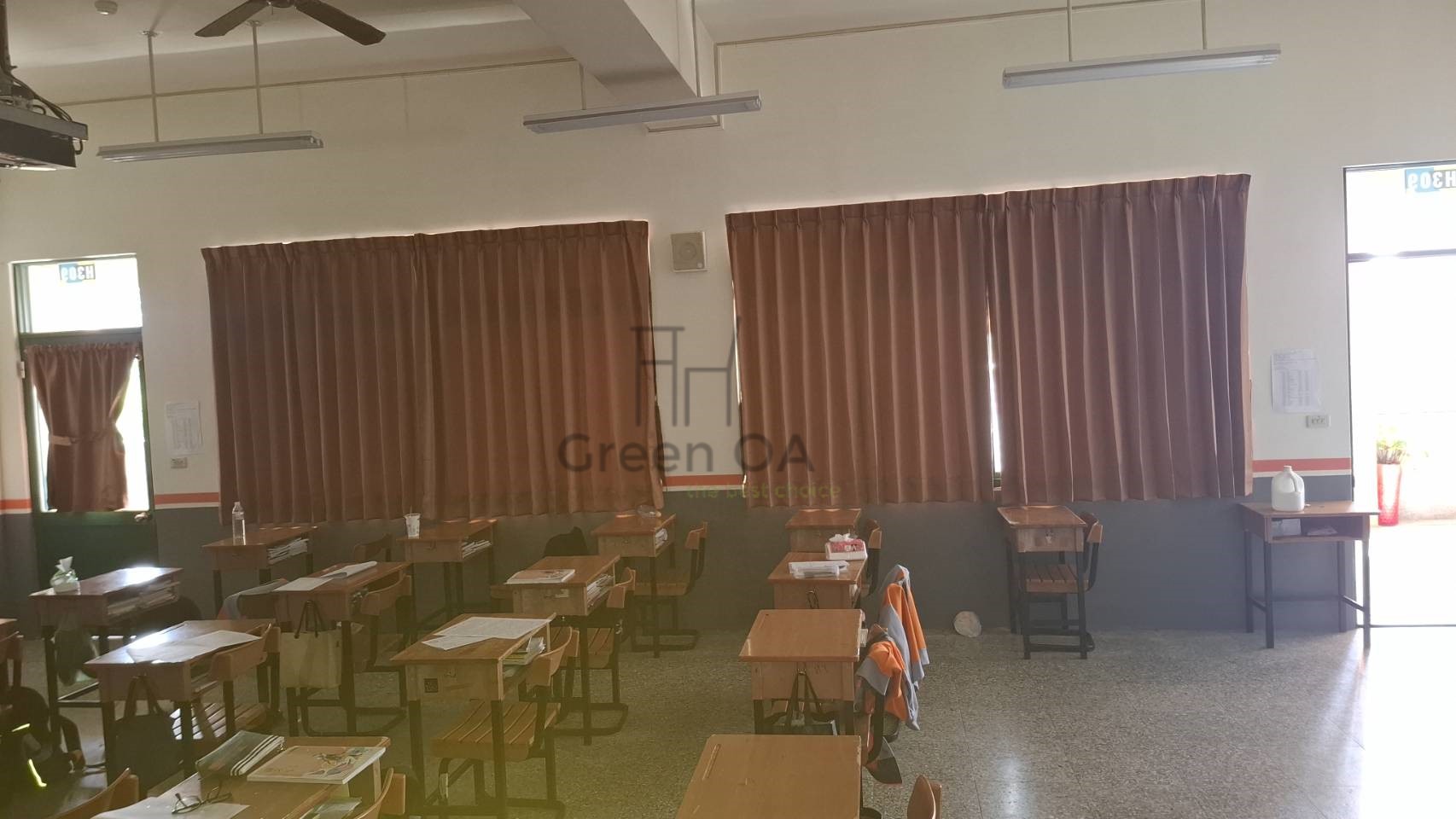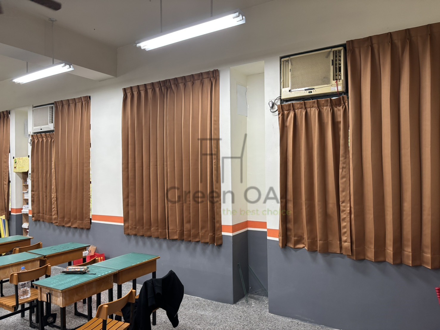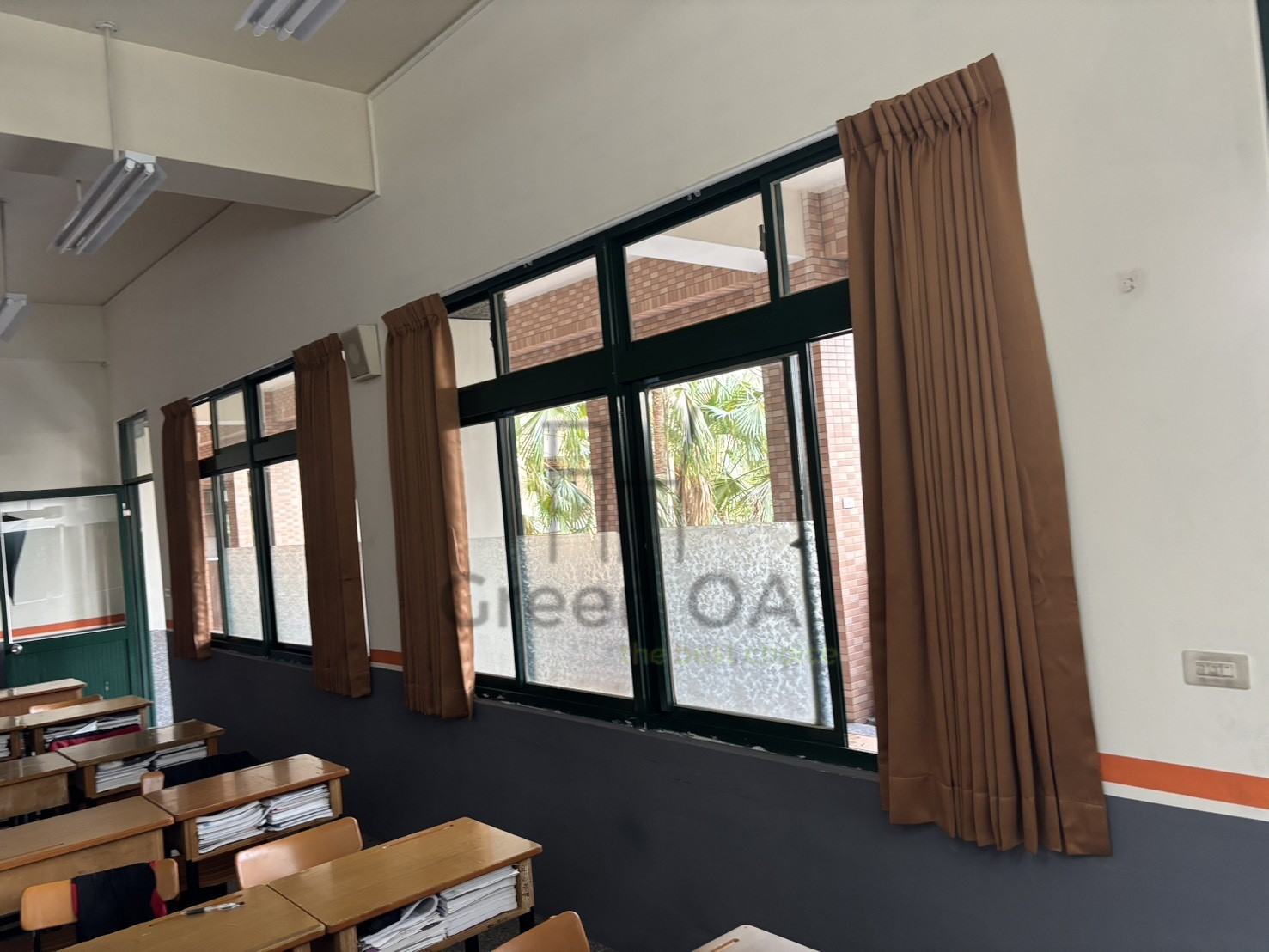 此案為窗簾安裝工程,採用高遮光布料設計,能有效阻擋外部強光、降低室內溫度,同時維持舒適的學習與工作環境。整體色調選用溫潤的咖啡色系,搭配教室牆面與木質桌椅,營造柔和且穩定的空間氛圍。窗簾收邊俐落、垂墜度佳,操作順暢,兼具實用性與整體美觀。此案充分體現 Green OA 對學校與公共空間整體環境優化的專業規劃能力,從功能性、耐用度到整體視覺協調,皆達到完善平衡。