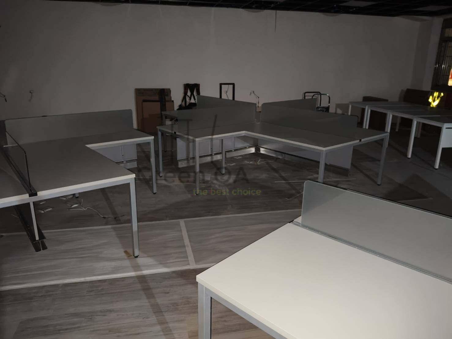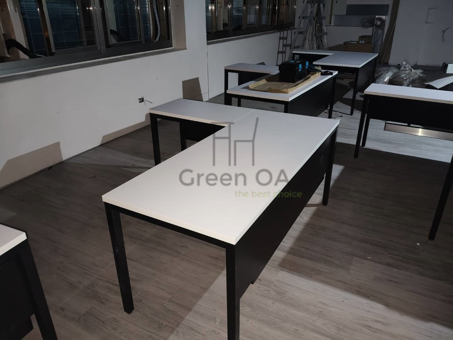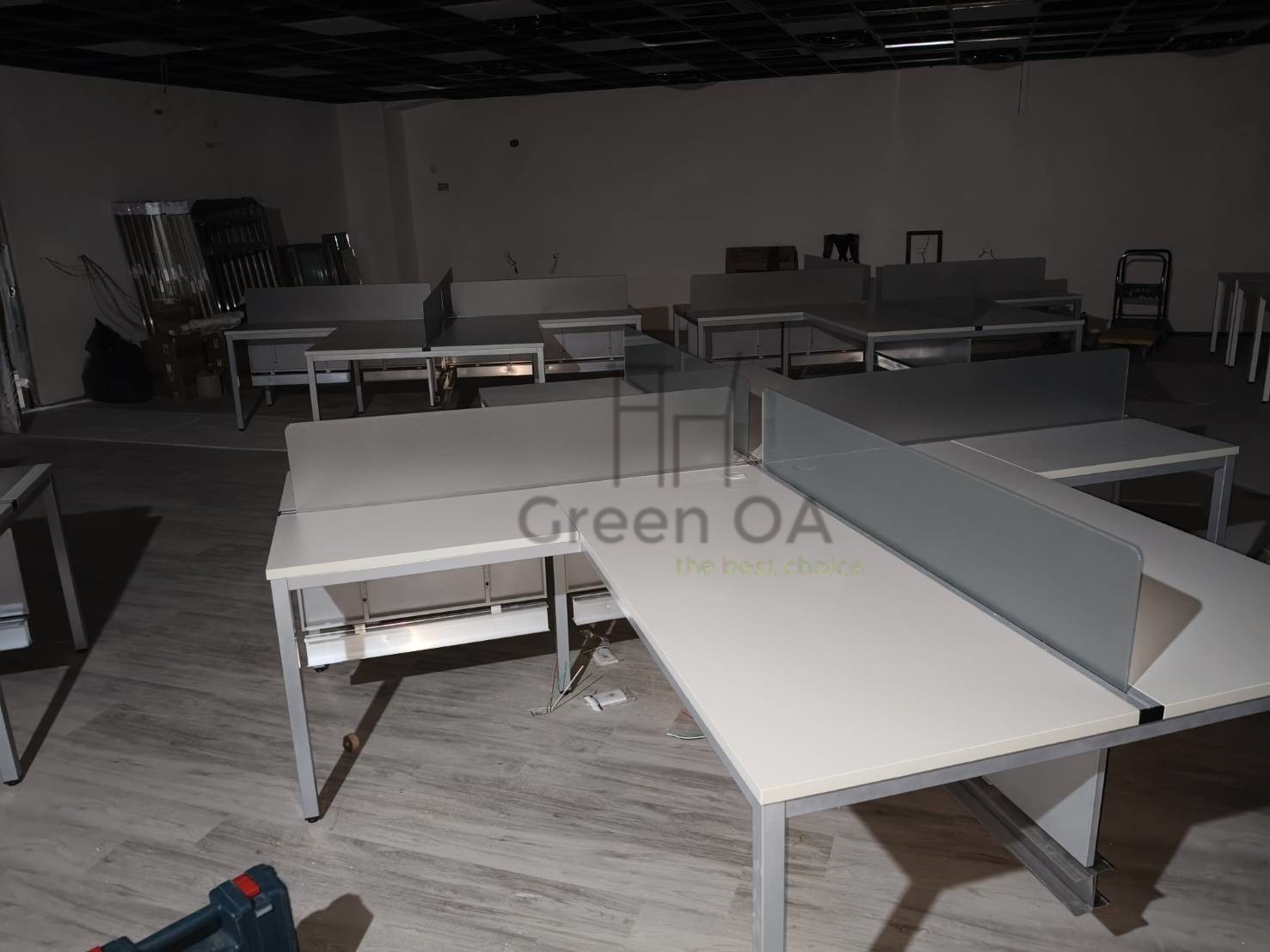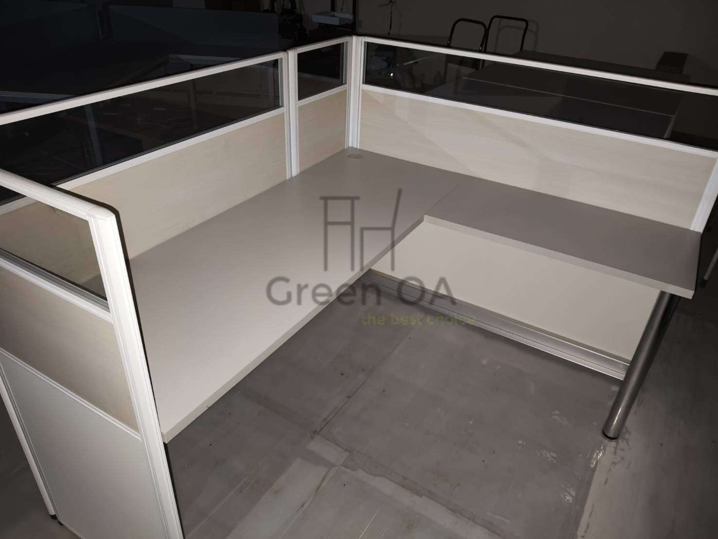 本案採用2.5 屏風(122 高)烤白+主桌+側桌+S40 工作站+桌上屏的整合配置,打造明亮且高效率的辦公環境。122 公分高烤白屏風有效區隔座位,降低干擾,同時維持空間通透感;主桌與側桌提供延伸作業檯面,支援多工處理。S40 工作站強化團隊配置效率,桌上屏則進一步提升個人專注度。整體風格簡潔一致,兼顧實用機能與專業形象,適合行政與團隊型辦公空間。
