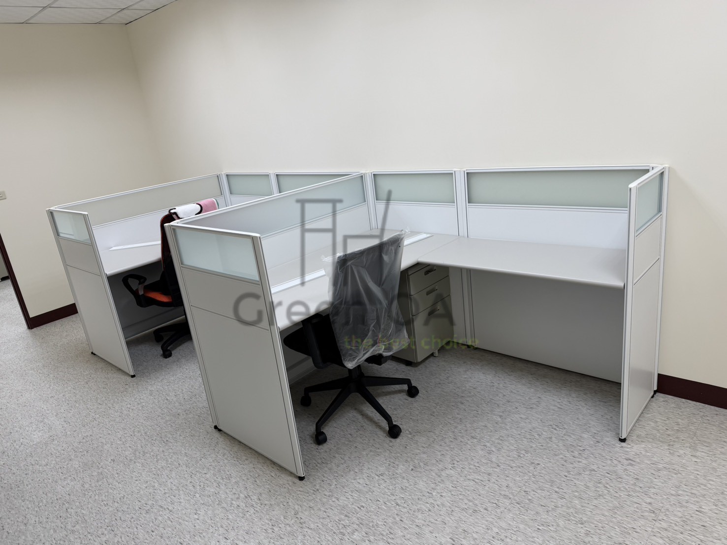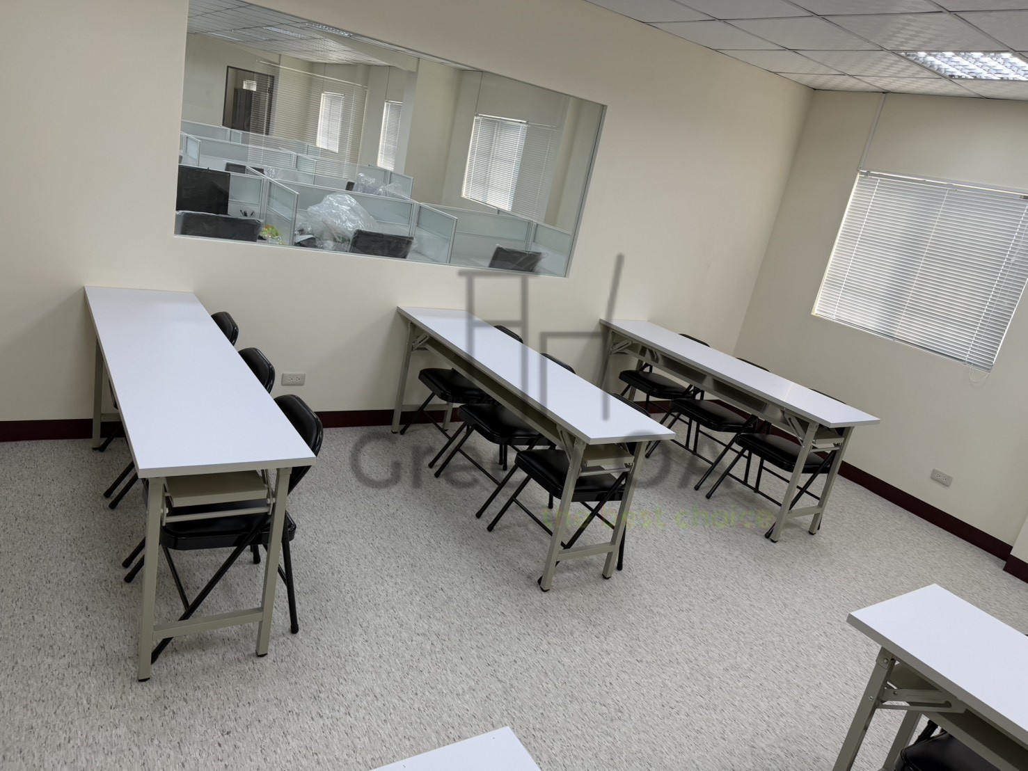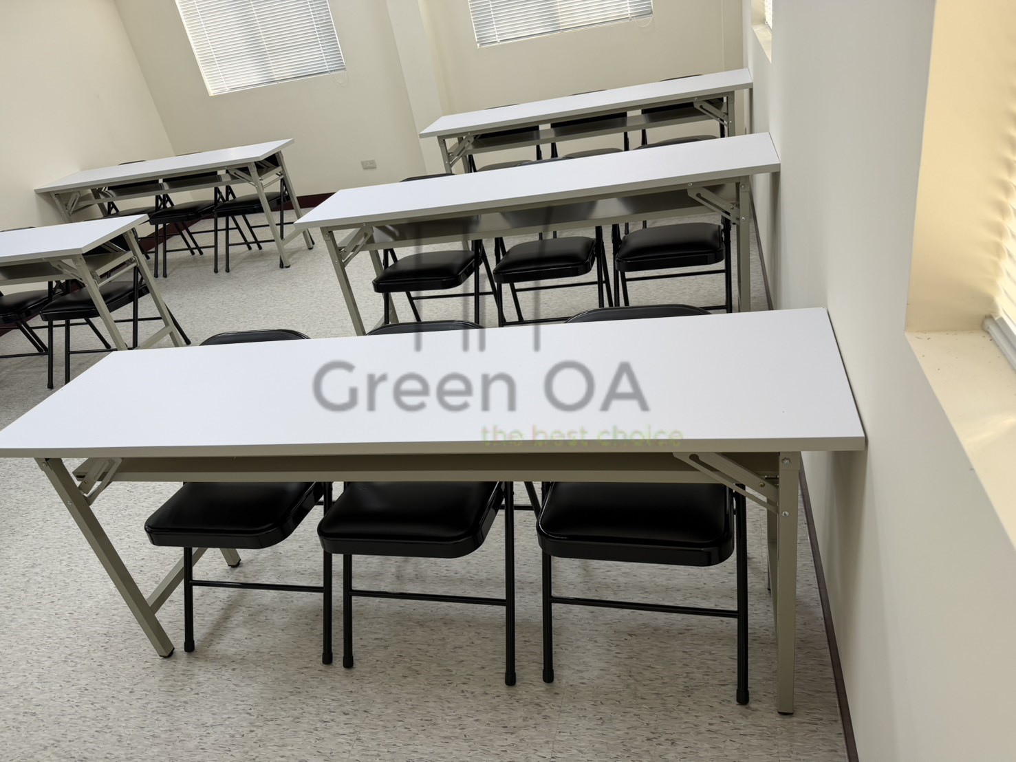 針對這套涵蓋高密度辦公、彈性會議與專業後勤的整合配置,GREEN OA 致力於在多元機能中建立統一美學。空間核心採用 2.5系列烤白屏風 搭配主側桌與職員椅,營造明亮且具隱私的工作站。為了應對變動需求,方案整合了可快速佈署的 H型白色折合桌與黑皮折合椅,讓空間在訓練與討論間自由切換。