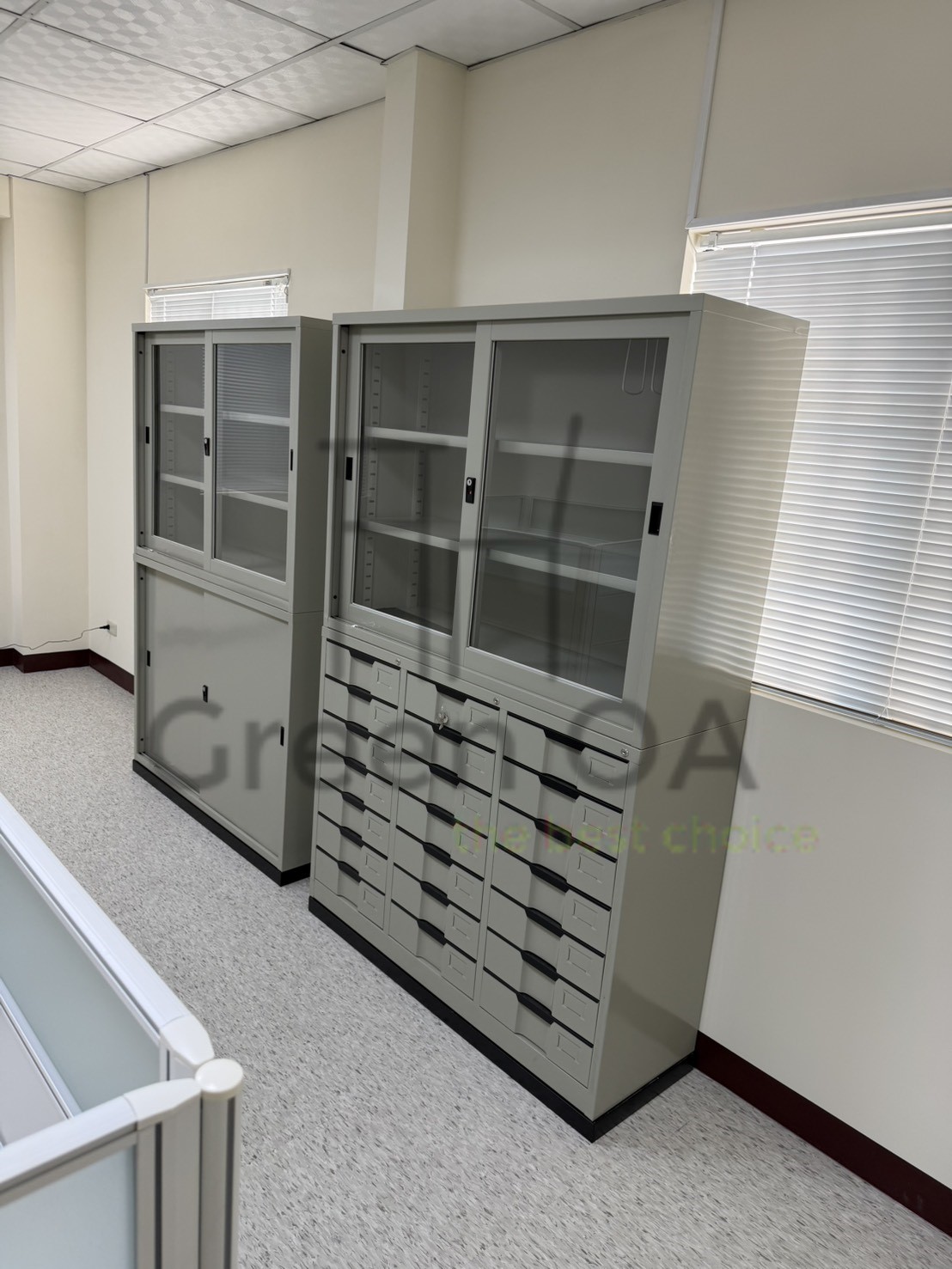 在收納管理方面,配置 4尺玻璃公文櫃、21屜分類櫃 與 9人座衣櫃,確保海量資料與個人物品皆井然有序。結合 白板及其斜放架 構築的創意節點,這套全方位方案從行政作業到後勤支援,皆展現了簡約、堅固且高效的職人工藝,為客戶打造專業與韌性兼具的現代職場格局。