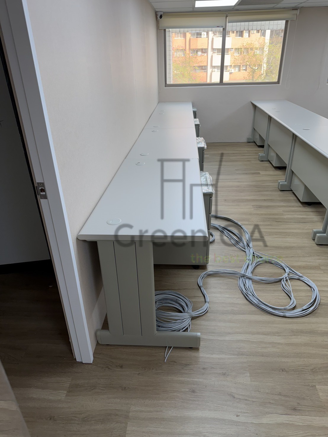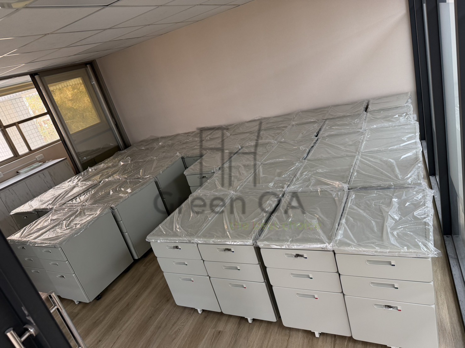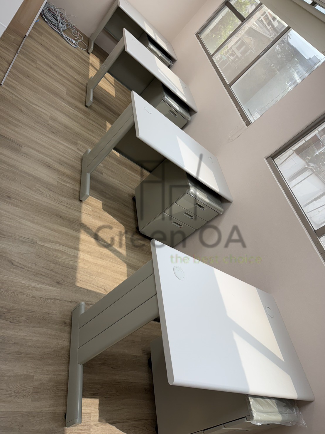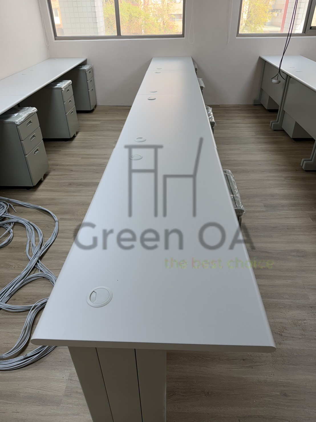 在空間佈局上,我們透過長向的連排配置,創造出極佳的視覺延伸感與團隊協作動線。每一處工作位皆配置了一體化出線孔,確保電源與網路線路井然有序;桌下則搭配高機能的活動三抽櫃,為同仁提供充足的個人收納深度。透過 GREEN OA 的系統化家具,我們協助客戶在簡潔的灰白色調中,構築出一個穩固、專業且能隨時應對高強度作業的現代職場空間。
