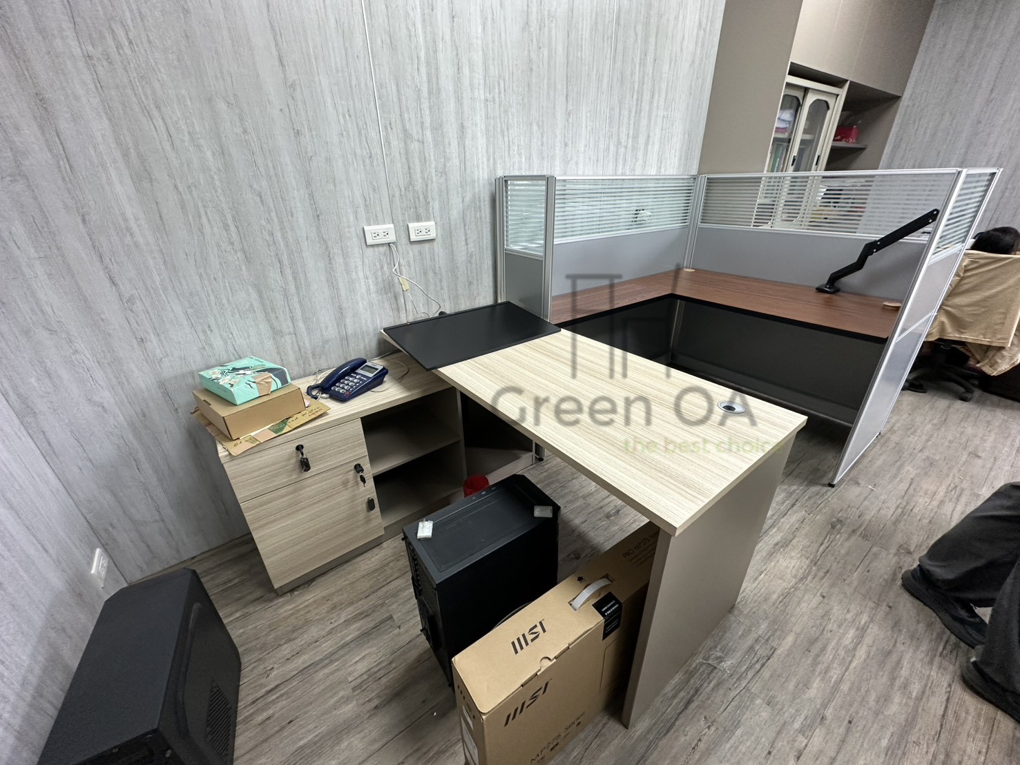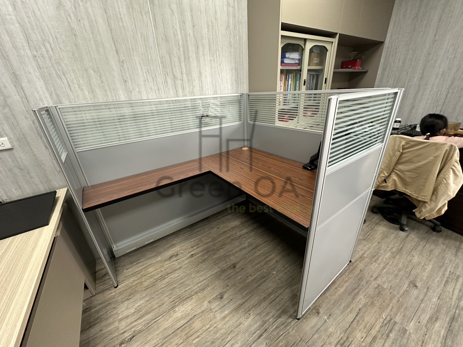 針對主管區域,則選用了沈穩的胡桃木色直角桌板與側桌板,並配置大器的 L 型主管桌,透過深色系木質紋理彰顯權威感與領導氣質。同樣 132 公分高的屏風在維持視線通透的同時,亦能確保主管所需的獨立思考空間。透過 GREEN OA 的系統化家具,我們成功在同一場域內,利用色系切換完美整合了「行政作業」與「主管決策」兩大核心機能,打造出層次分明、質感和諧的現代辦公環境。