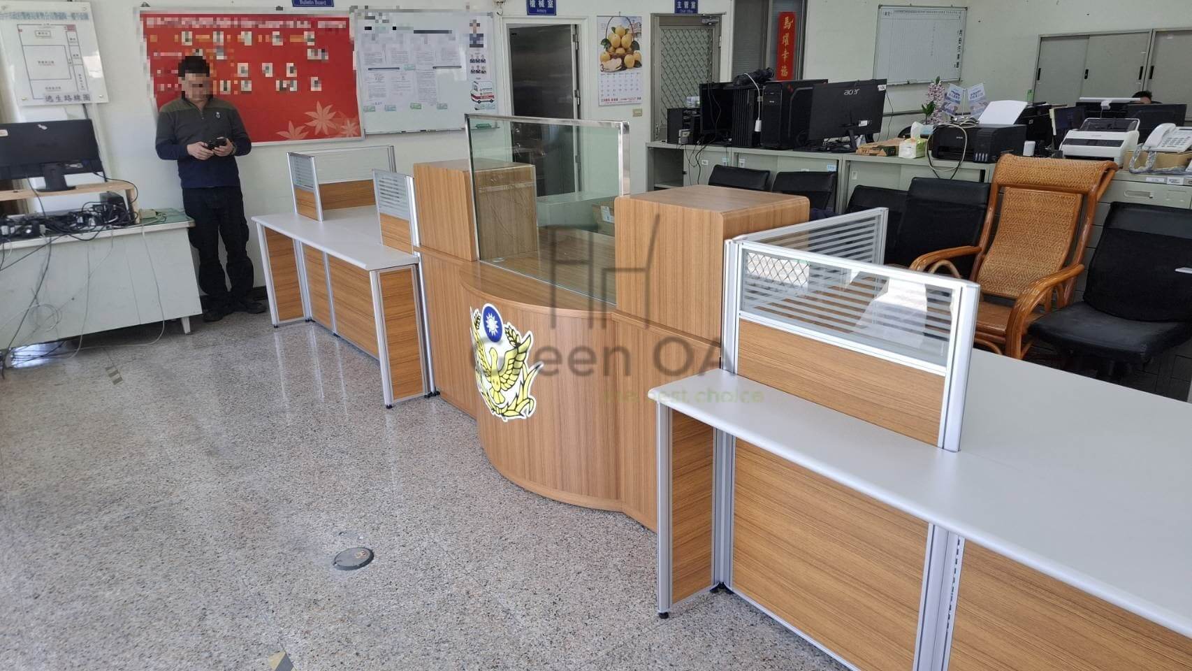 本案展現了 GREEN OA 對於辦公動線的細膩思維,採用 2.5系列屏風 進行「高低位階」的複合配置。利用 112公分高 屏風作為個人工作位的正面屏障,有效阻隔視覺干擾,確保同仁思考的獨立性;而側邊則銜接 71公分低屏風,與主桌高度齊平,不僅消除了狹窄空間的壓迫感,更方便同事間隨時進行資訊傳遞與互動溝通。