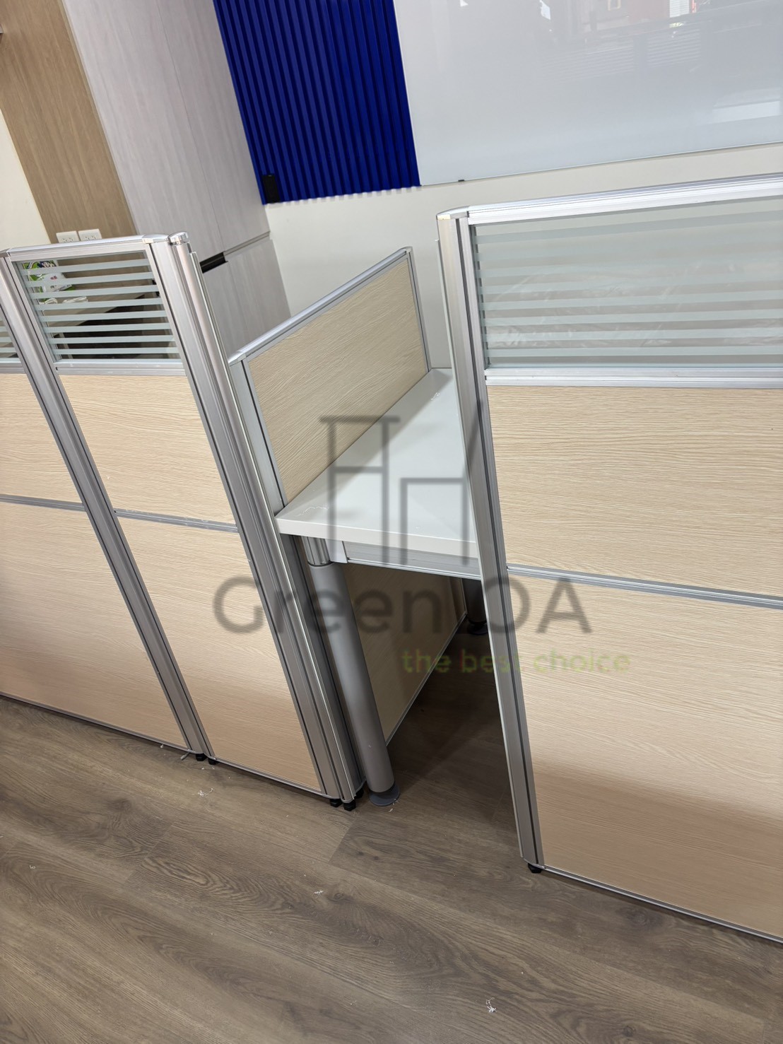 屏風框架採用輕量化且堅固的鋁合金材質,飾板則可依企業風格靈活搭配溫潤木紋或洗練布面,上方更可結合橫紋噴砂玻璃層次,在保障隱私的同時引進充足採光。透過 GREEN OA 的系統化規劃,這套屏風不僅定義了空間的秩序,更在簡約的線條中實踐了對「專注」與「協作」的雙重承諾,是建構現代化專業職場所需的基礎核心。
