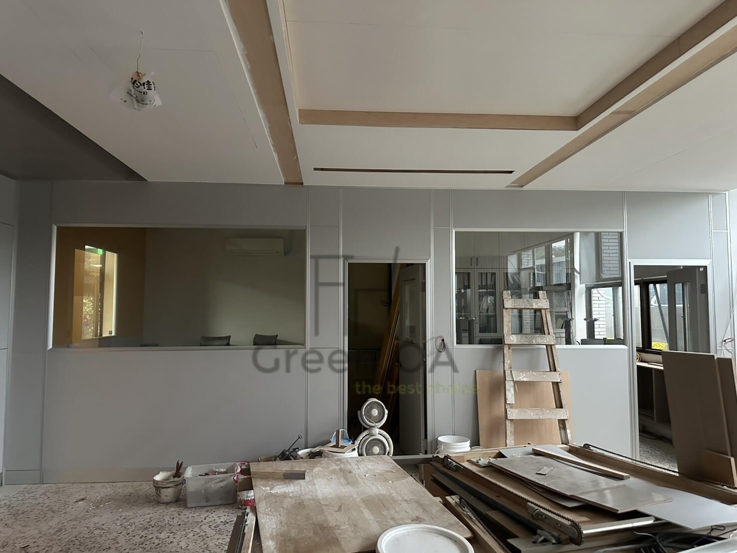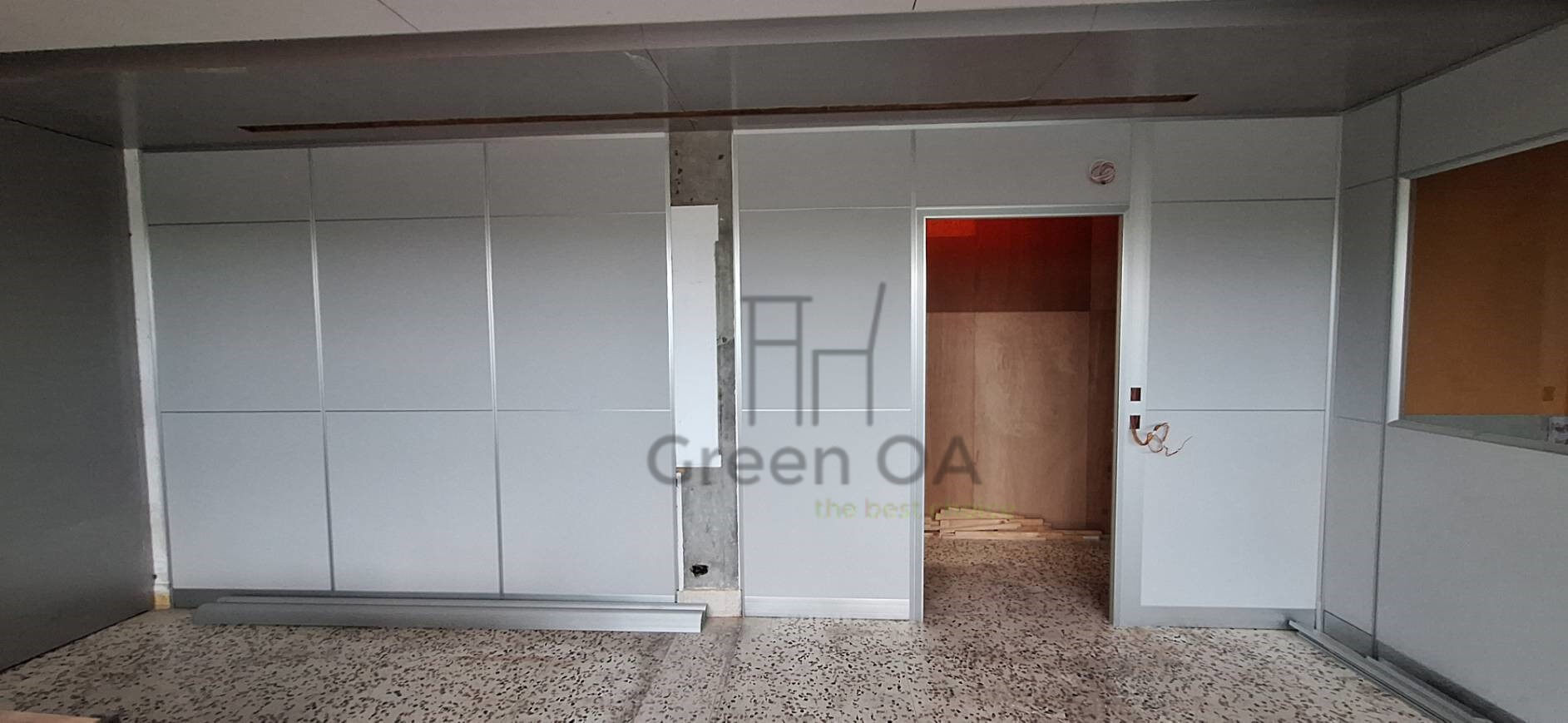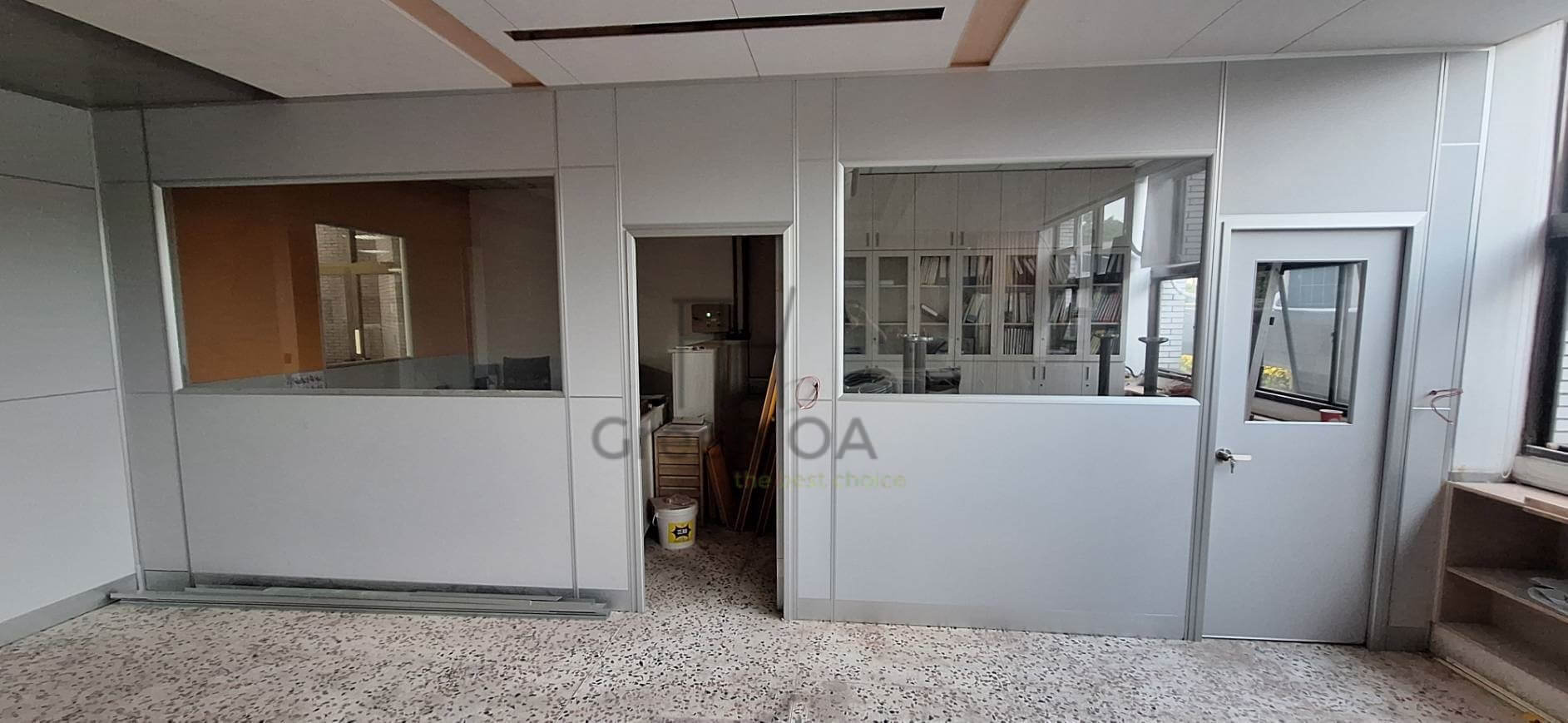 此案為 高隔間施工,以鋁合金結構搭配灰白色調面板,打造俐落且具現代感的分隔空間。牆面採高隔間系統設計,有效提升隔音與隱私性,同時保留光線穿透,使整體空間更明亮寬敞。門框與線條細節皆精準收邊,展現 Green OA 專業的施工品質與整體一致的美感。此案不僅強化空間機能,也兼顧美觀與實用性,是辦公空間重整與規劃的理想方案。