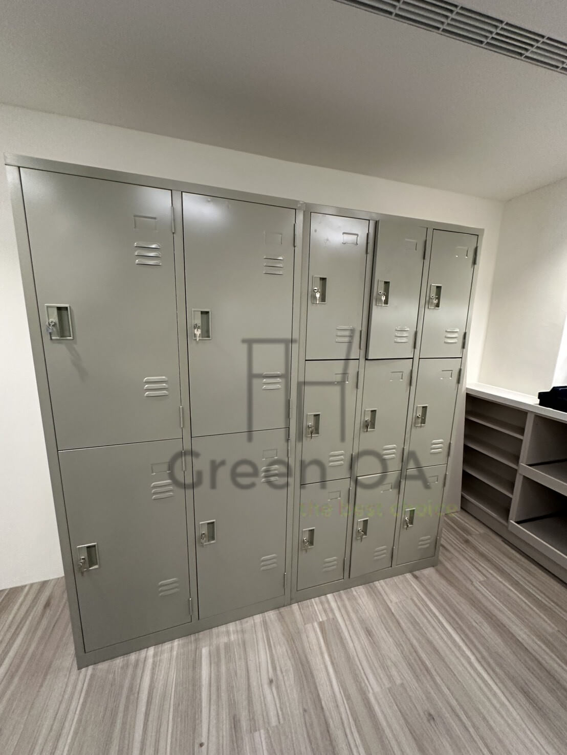 此案為 4人衣櫃 + 9人衣櫃,整體以灰色鋼製材質打造,外型簡約俐落,兼具實用與耐用特性。每一格皆配有獨立鎖具與通風孔設計,兼顧隱私與散熱效果,適用於學校、醫療院所、廠辦及企業員工更衣空間。櫃體穩固耐重,門片開闔順暢,能有效提升空間整潔度與管理效率。此組合充分體現 Green OA 在公共及辦公收納設備上的整合能力,兼顧安全、便利與整體美觀性。