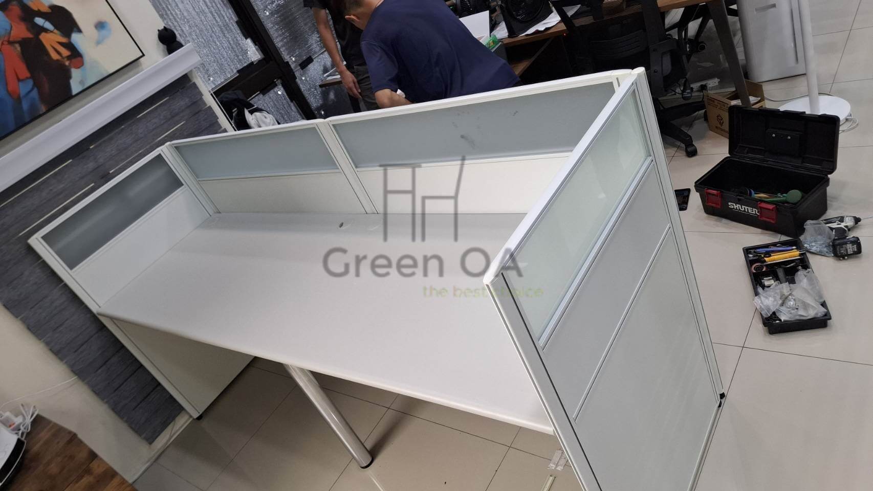 此案為 2.5 屏風(112 高)烤白色 + 主桌,整體以明亮白色系為主軸,營造乾淨俐落的辦公氛圍。屏風高度 112 公分,恰到好處地保留開放感與個人隱私,讓員工在專注與互動間取得平衡。鋁框採烤白處理,線條細緻、質感輕盈,搭配簡約木紋主桌,使整體空間更顯現代與舒適。此配置適合行政辦公區或研發單位,兼顧實用與美觀,充分展現 Green OA 在辦公空間整體設計上的專業美學與功能整合能力。