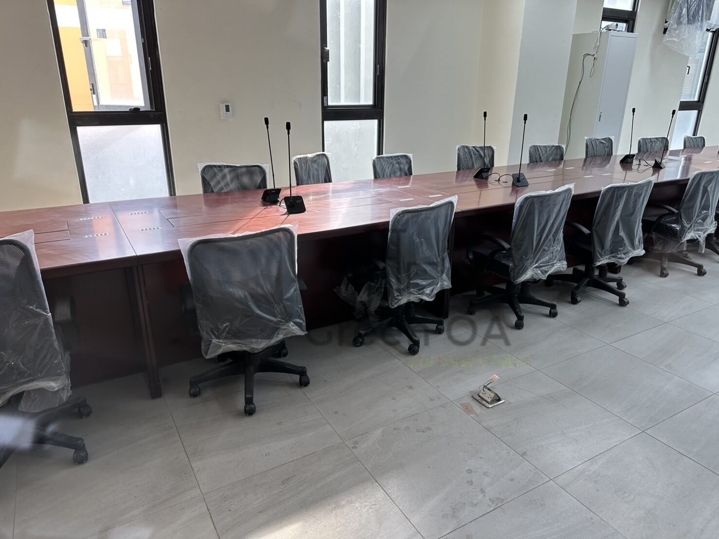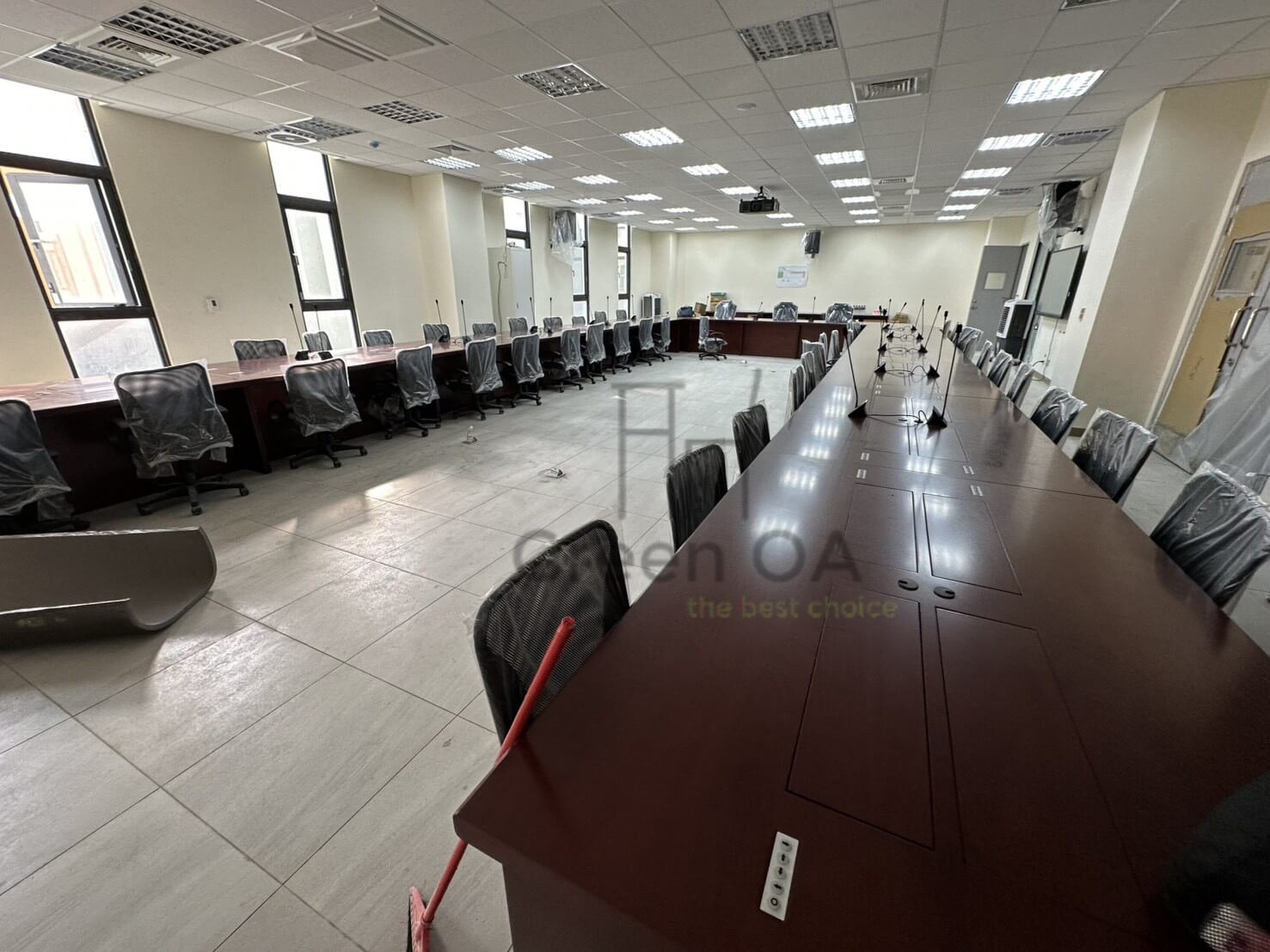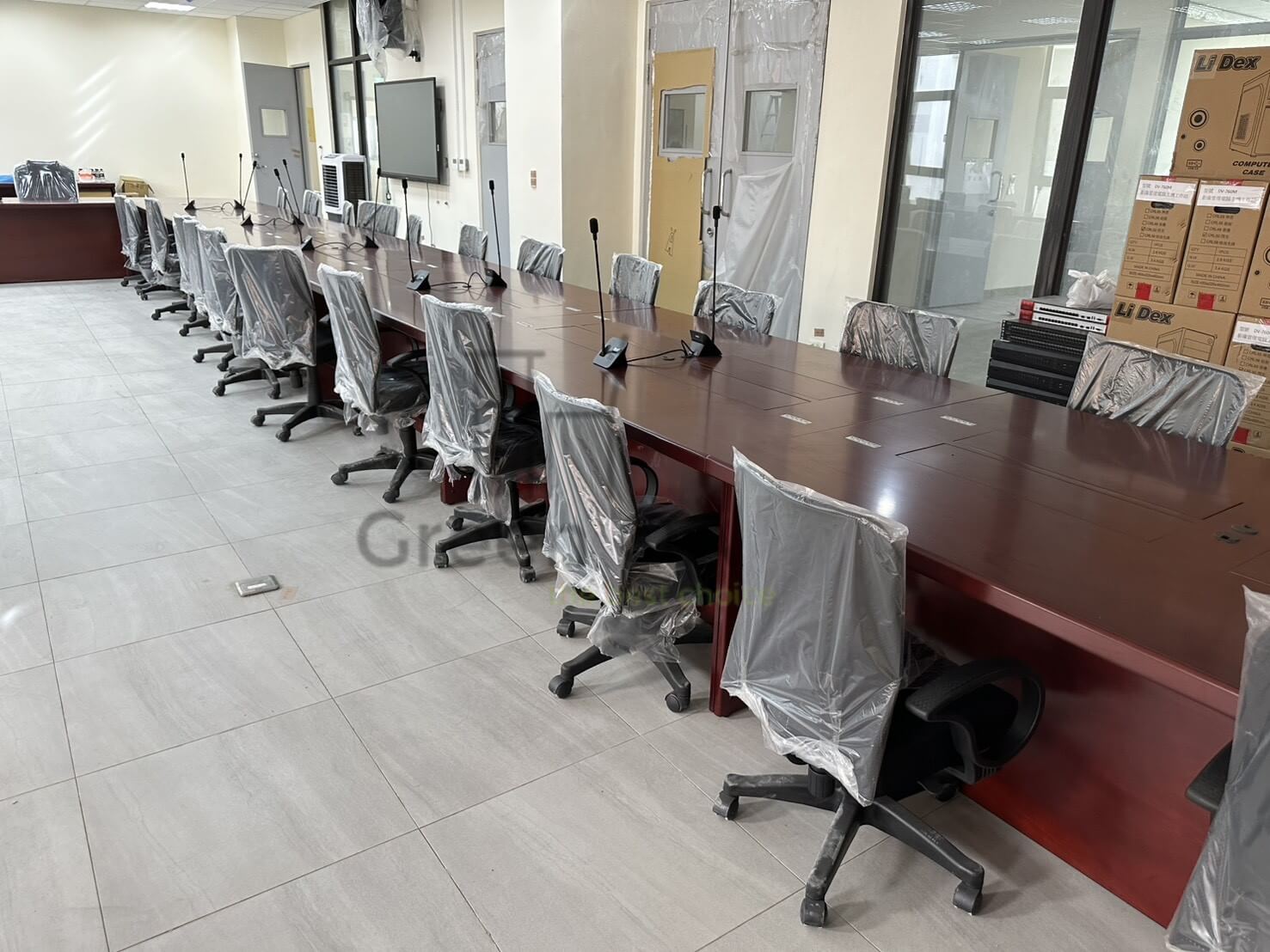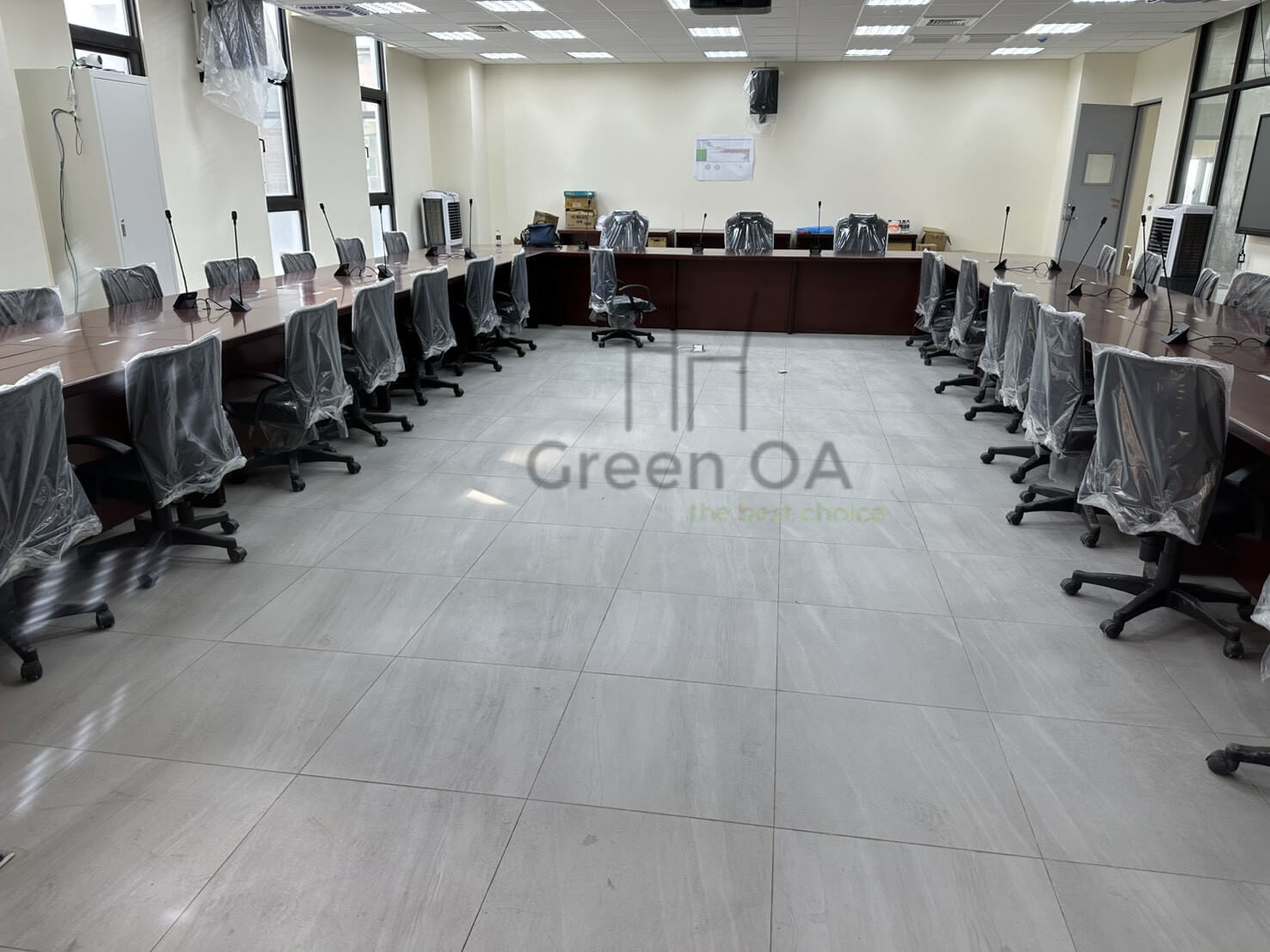 此案為 環式會議桌 + 會議椅,以大尺度環形桌面打造沉穩有序的會議氛圍,適合多人同時使用與討論。桌面採深胡桃木紋設計,質感沉穩厚重,搭配桌面內建線槽及麥克風配置,整體兼具實用與專業形象。搭配人體工學高背會議椅,座感舒適、支撐性佳,長時間開會仍能維持良好坐姿。此組合充分展現 Green OA 在大型會議空間整合設計的專業能力,兼顧視覺協調與功能完整性,營造高效決策環境。