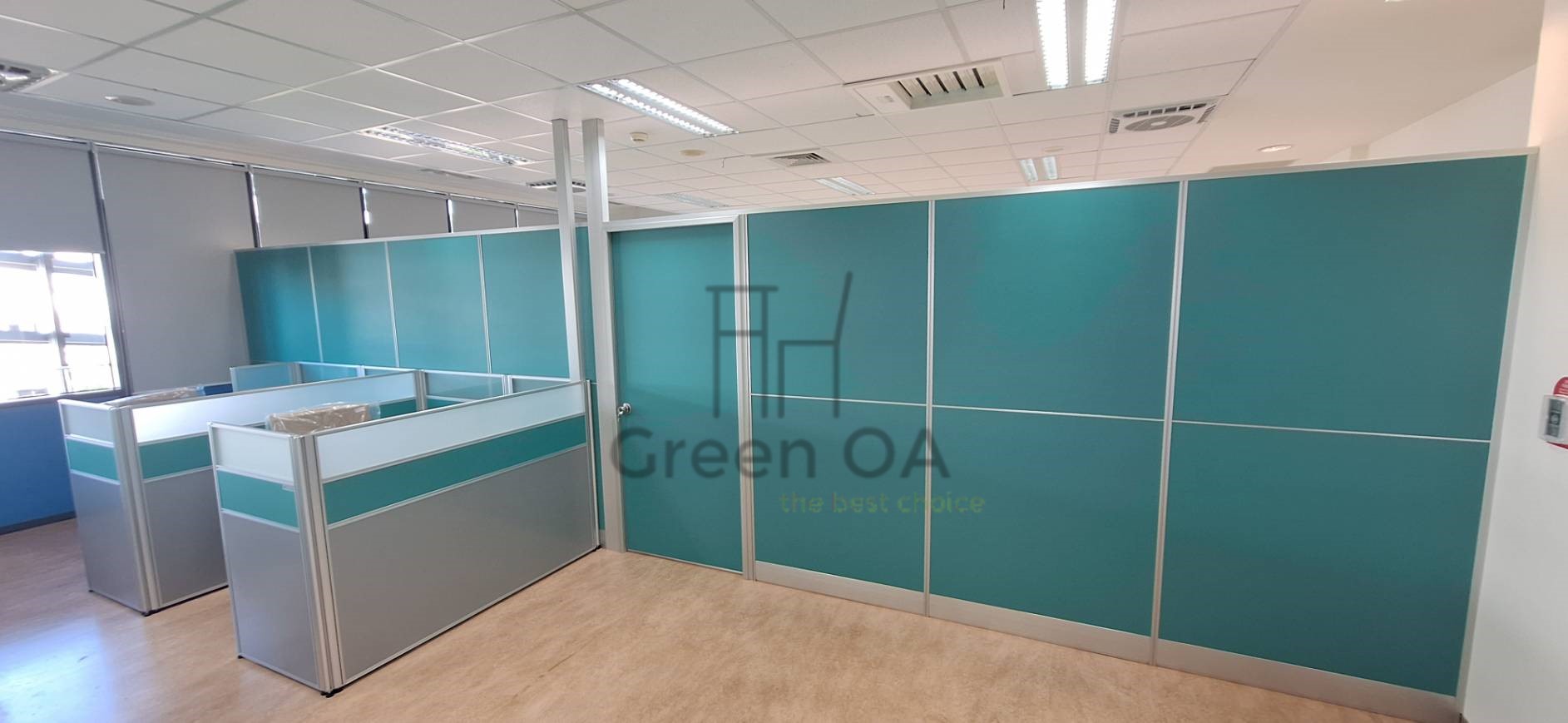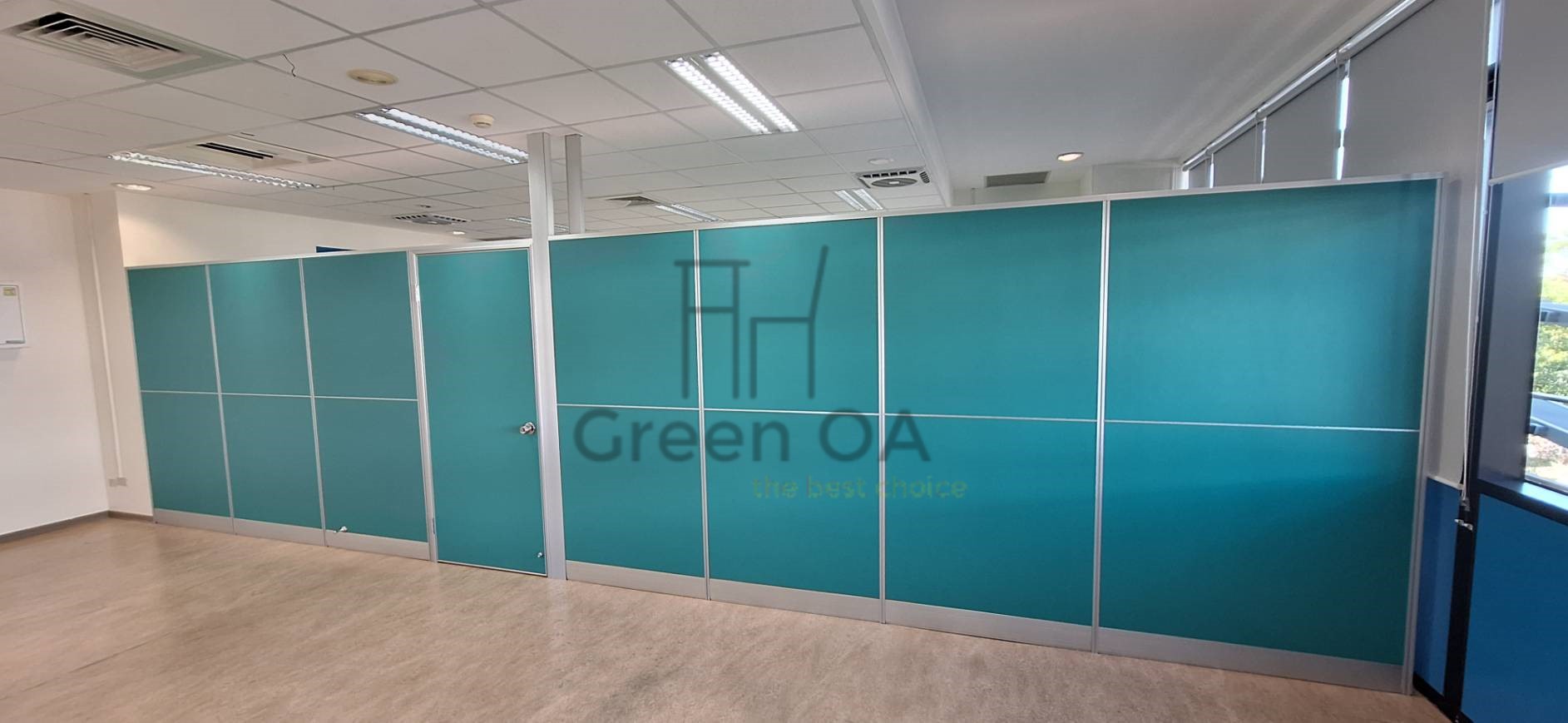 此案為 高隔間工程,以亮眼的湖水綠面板打造清新、活力十足的辦公氛圍。整體採用鋁框搭配高質感面板,線條俐落、分割比例均衡,不僅提升空間視覺層次,也讓場域更加明亮開闊。高隔間高度完整、隔音佳,適合作為獨立辦公室、教室、討論區或多功能空間的分隔使用。門片同色系設計,使整體視覺一致性更強。色調明快、富現代感,營造舒適又專業的工作場域。此案例展現 Green OA 在大型空間規劃與高隔間施工上的精準與細膩,從配色、比例到收邊工法都兼具美觀與實用,為客戶打造具功能性與設計感的分隔環境。