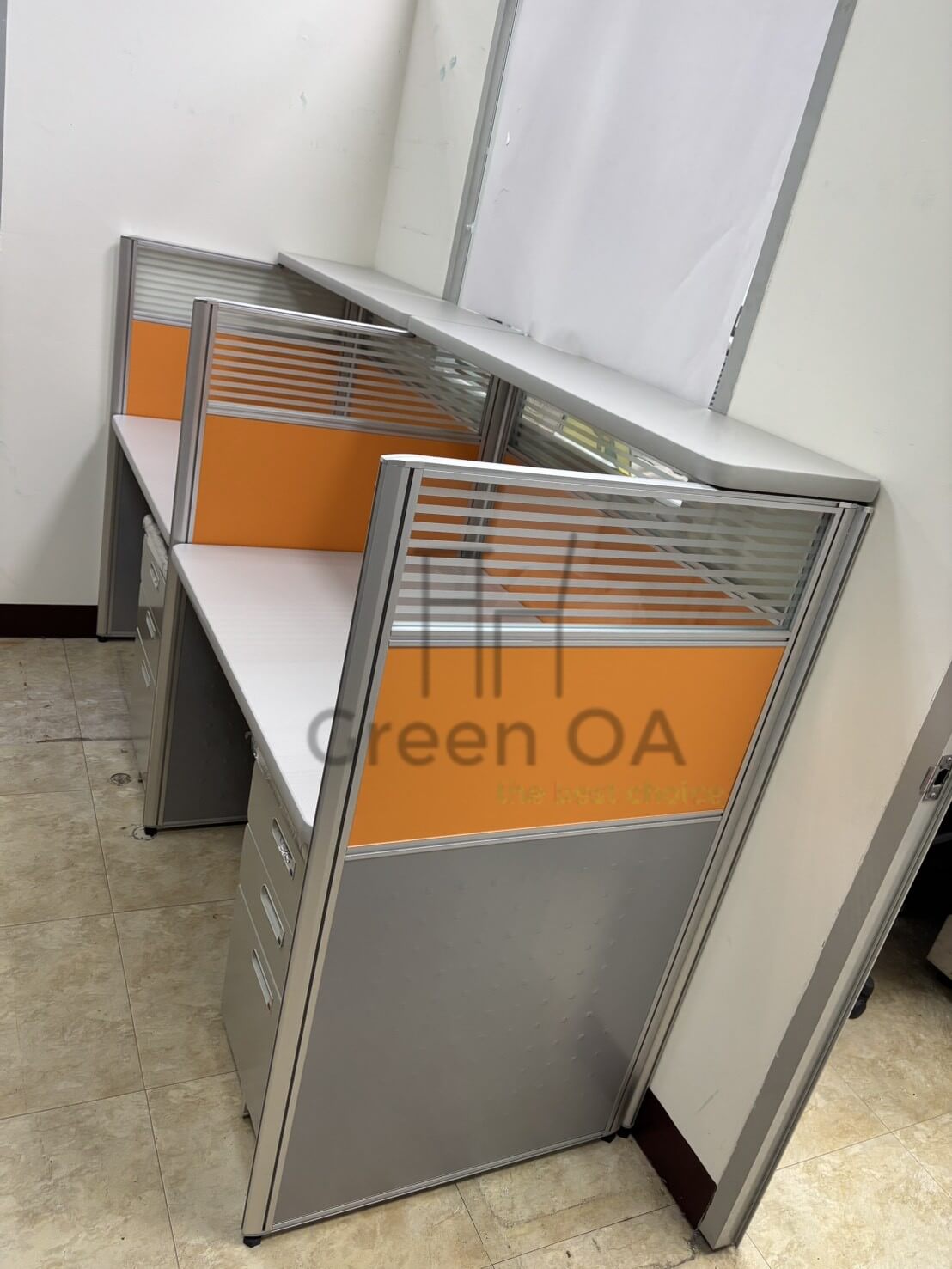 這組 2.5 屏風(122 高)搭配平條桌板、櫃檯板與活動櫃 的配置,以鮮明的橘色屏風作為視覺主調,營造出充滿活力、效率與正向能量的工作氛圍。上方加裝的櫃檯板提升空間層次,不僅能做為臨時擺放物的高平台,也讓座位在視覺上更具界定與整體性。桌板採用耐磨淺色設計,清爽明亮,有效放大工作面積的視覺感受;搭配穩固的鋼製活動櫃,提供充足收納空間,讓桌面保持整潔有序。