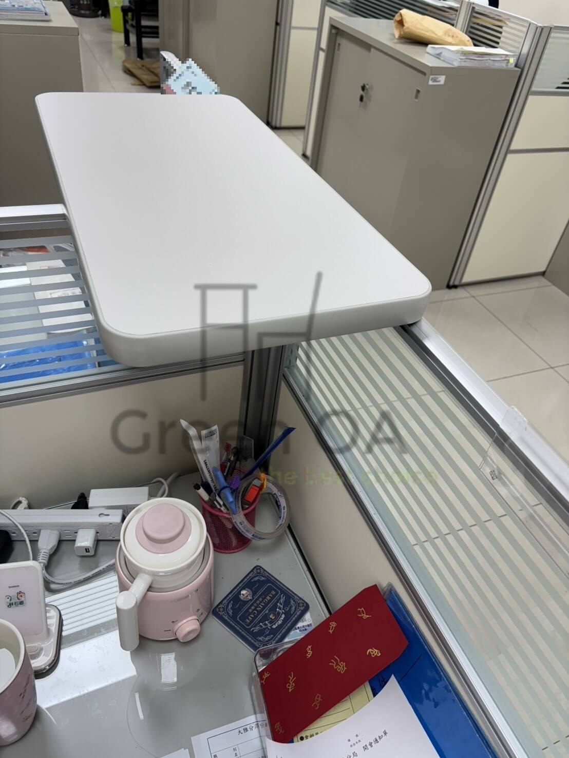 此案為在現有 2.5 屏風配置上加裝櫃檯板,透過俐落的白色桌板與鋁框結構結合,讓原本的隔間瞬間具備迎賓與接待功能。櫃檯板穩固、美觀,能有效延伸桌面深度,提供臨時書寫、文件遞交與訪客諮詢的便利空間,同時保持員工區域的隱私性與專注度。不論是行政櫃台、窗口服務或內部部門接待,都能藉由這樣的升級讓動線更清楚、互動更順暢,也展現企業整體環境的專業度與細緻度。