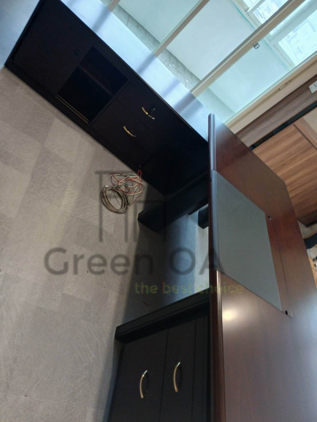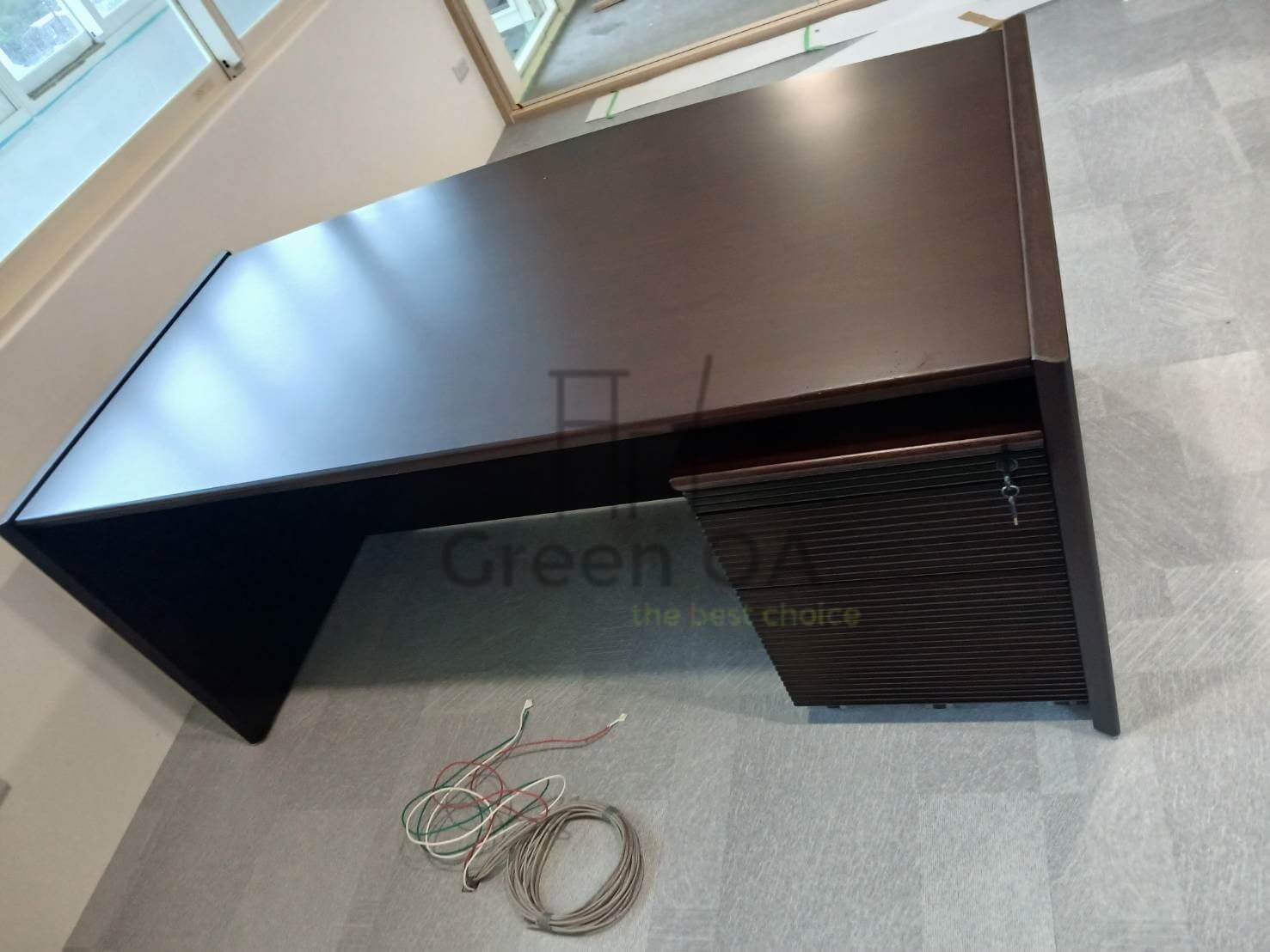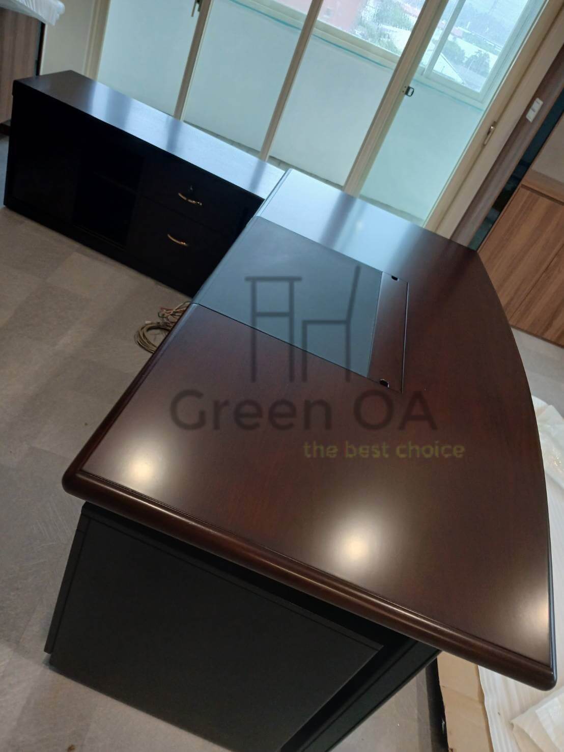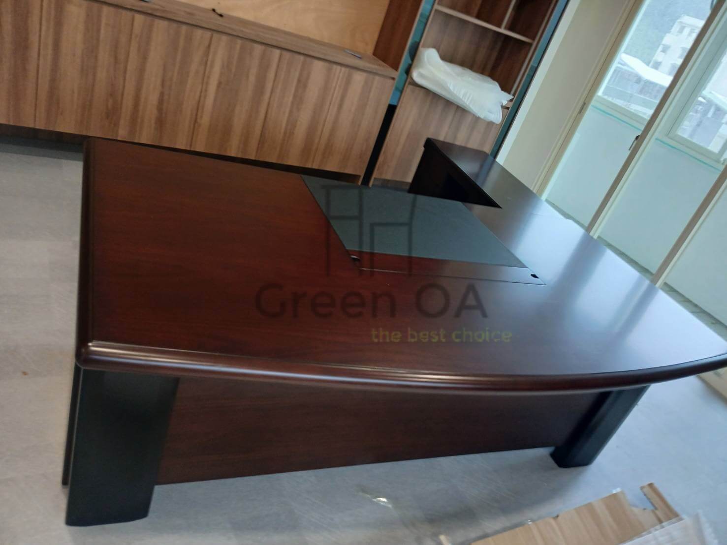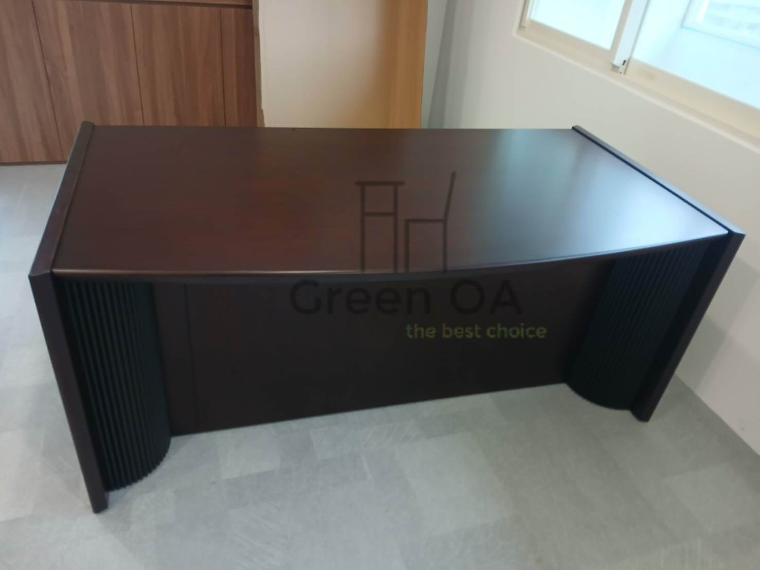 此案配置 ED 主管桌,以穩重深木色為主調,展現高階主管辦公空間的專業格調。桌體採弧形桌面設計,線條流暢優雅,搭配兩側立體造型支架,展現厚實結構與高質感工藝。桌面寬敞,可同時容納電腦、文件與洽談使用空間,兼顧功能與美觀。整體配色沉穩內斂,彰顯管理層的專業氣勢。此款主管桌非常適合獨立辦公室或高階接待區,能有效提升企業形象與空間質感。
