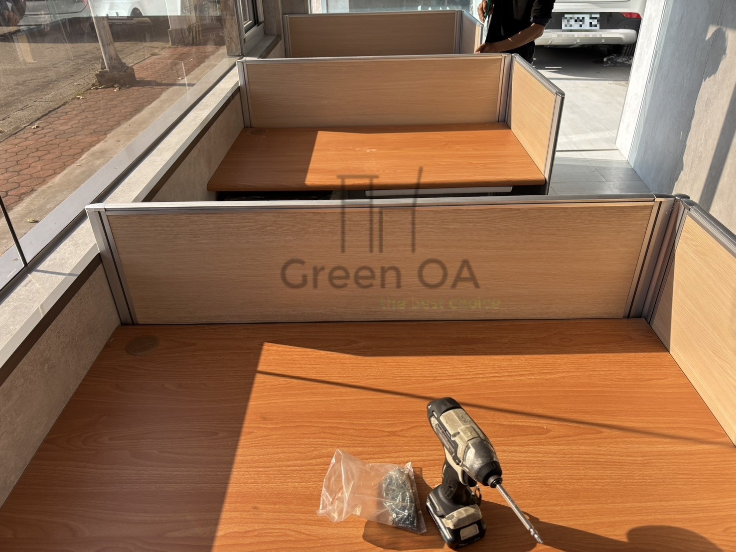 本次案例採用2.5 屏風(102 高)+木紋主桌+活動櫃+ABS 中抽的實用配置,兼顧開放感與收納效率。102 公分高的屏風提供基本區隔,維持空間通透;木紋主桌為工作環境注入溫潤質感。ABS 中抽方便收納常用文具,活動櫃則可依需求靈活移動,讓動線更順暢。整體配置簡潔有序,適合日常高頻率使用,展現 Green OA 對實務辦公需求的精準掌握。