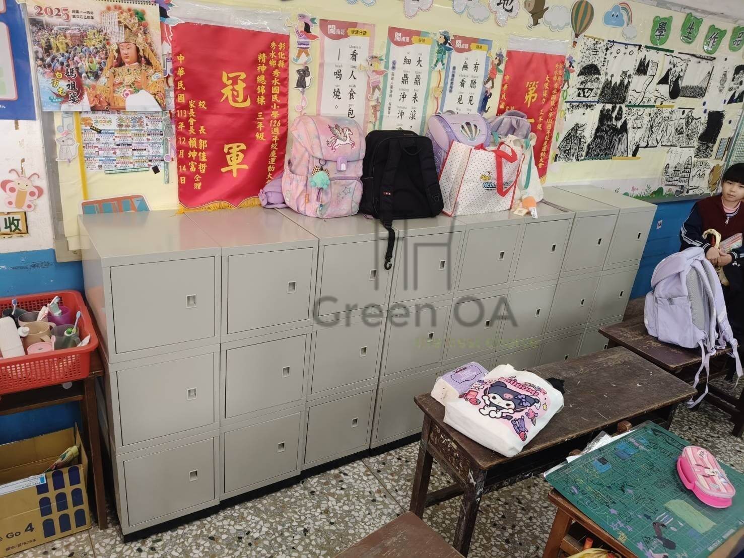 此次案例中的書包櫃設計著重於實用性與安全性,特別適合學校或教育空間使用。櫃體尺寸依實際收納需求規劃,方便學生放置書包與個人物品,有效避免地面凌亂,維持環境整潔。結構穩固、邊角圓滑,兼顧耐用度與使用安全,讓日常取放更安心。整體外型簡潔不花俏,能自然融入教室或公共空間配置,不造成視覺負擔,充分展現 Green OA 對教育現場實際使用情境的細心觀察與規劃能力。
