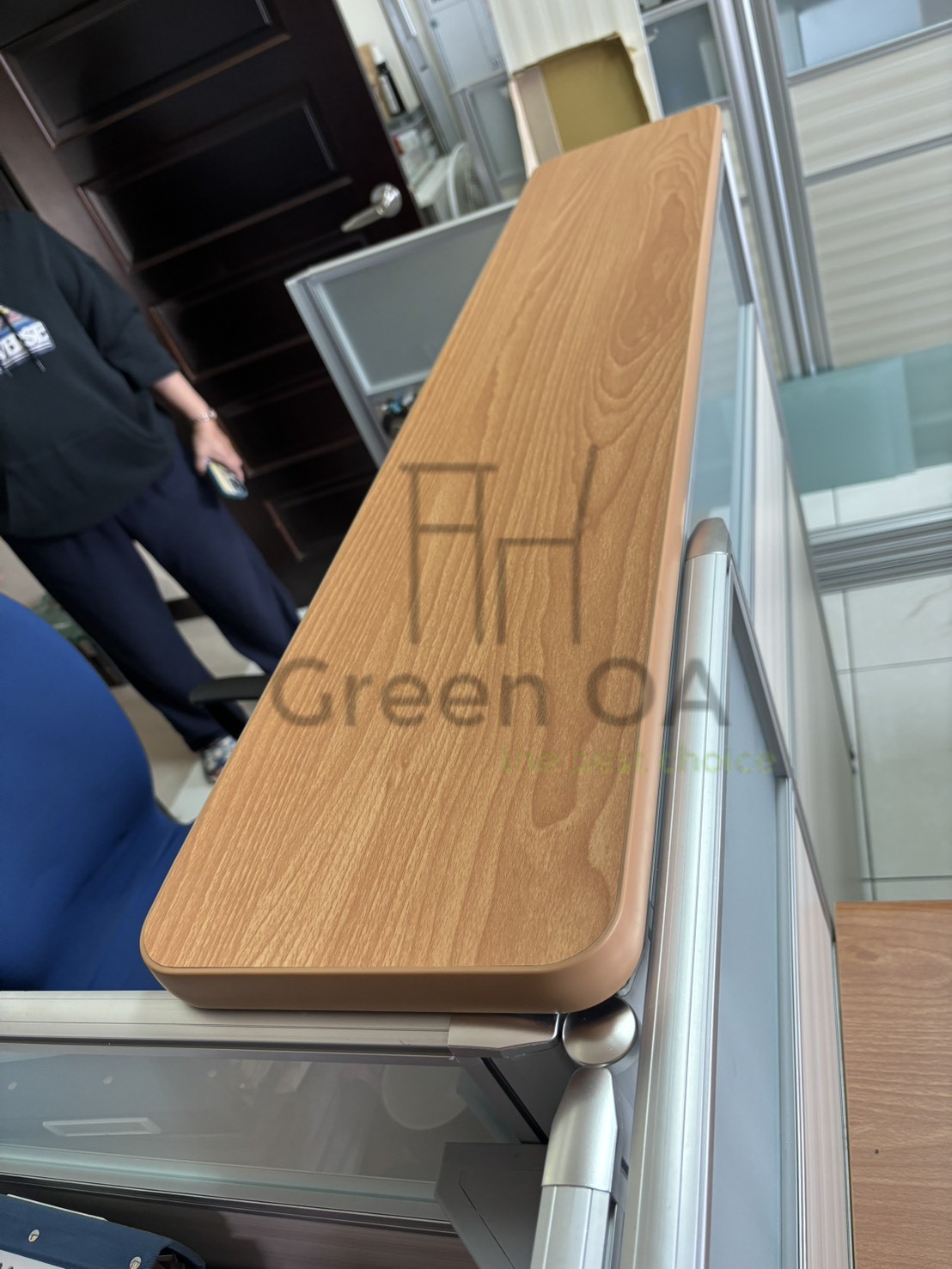 在介面設計上,我們全面整合了「木紋主桌、側桌與櫃檯板」,透過一致的溫潤木質調,打破了傳統辦公家具的冰冷感,為接待場域注入了親和力。L 型的主側桌配置大幅擴張了作業深度,讓行政文書處理更為從容;而頂層加裝的櫃檯板則明確劃分出對外服務區域。我們透過這組一體化的木紋系統配置,為客戶建構出一個層次分明、氣氛溫暖且極具企業質感的專業行政空間。