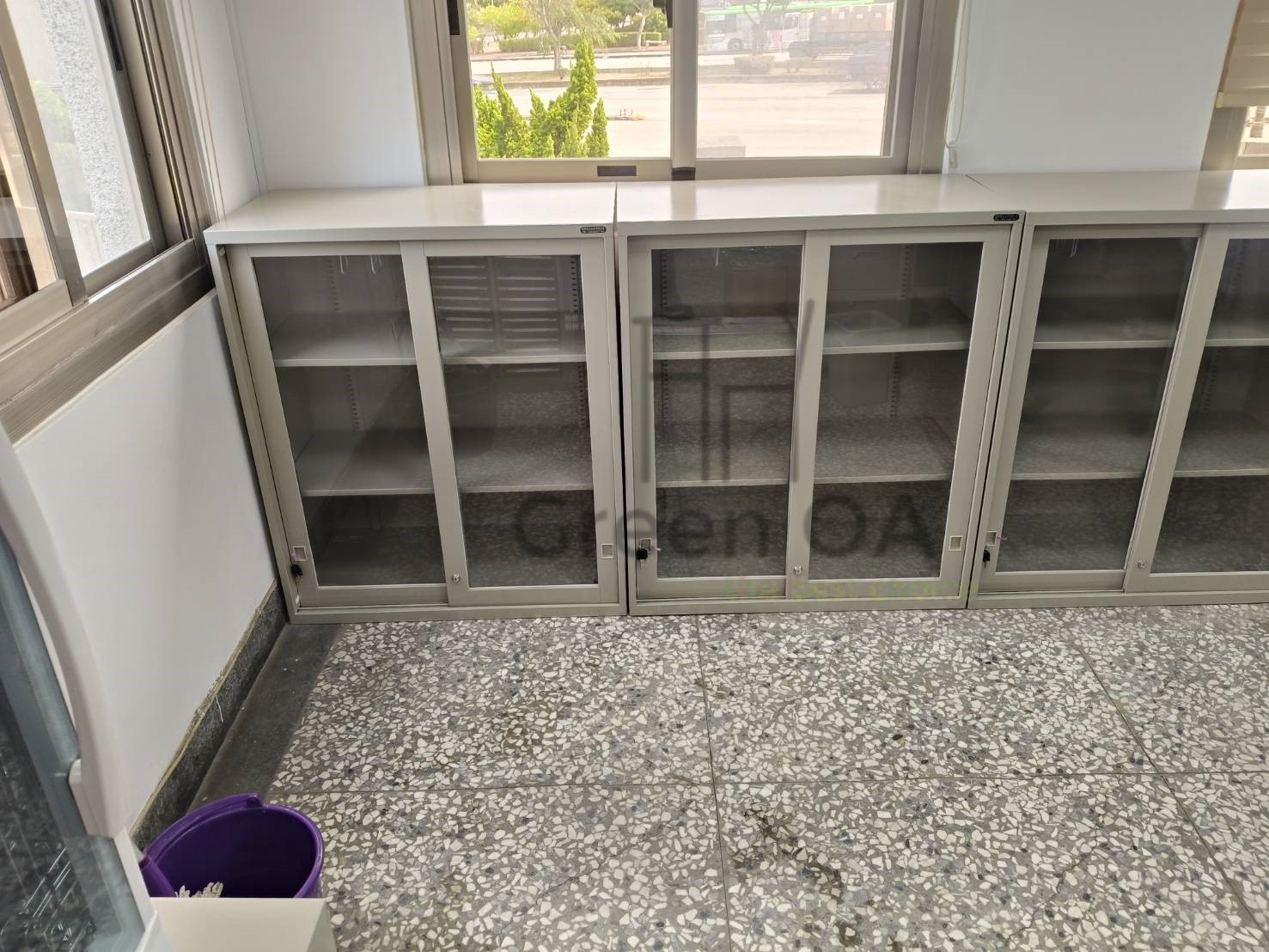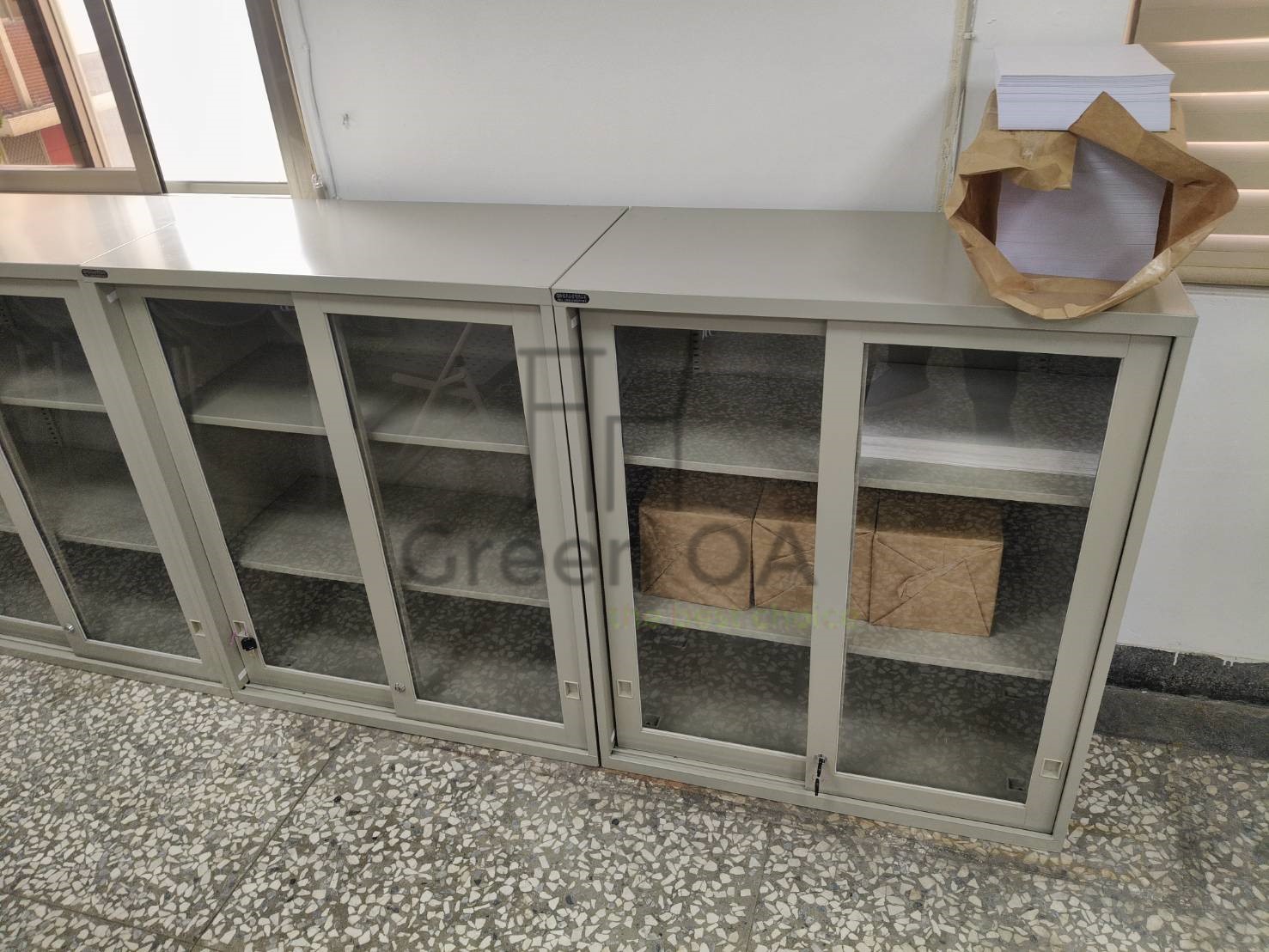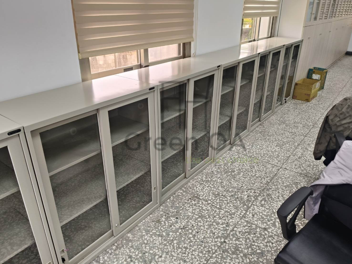 與其對映的是玻璃加框公文櫃,透明的門片設計讓內部存檔一目了然,無需開啟即可快速定位所需資料,極大化日常作業效率,同時金屬框架確保了整體的穩固與耐用。透過 GREEN OA 的精準配置,我們在同一空間內整合了「封閉式安全」與「開放式便利」,協助客戶建立起層次分明、高效有序的現代化辦公倉儲系統。