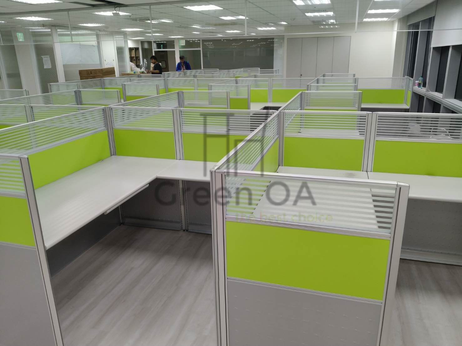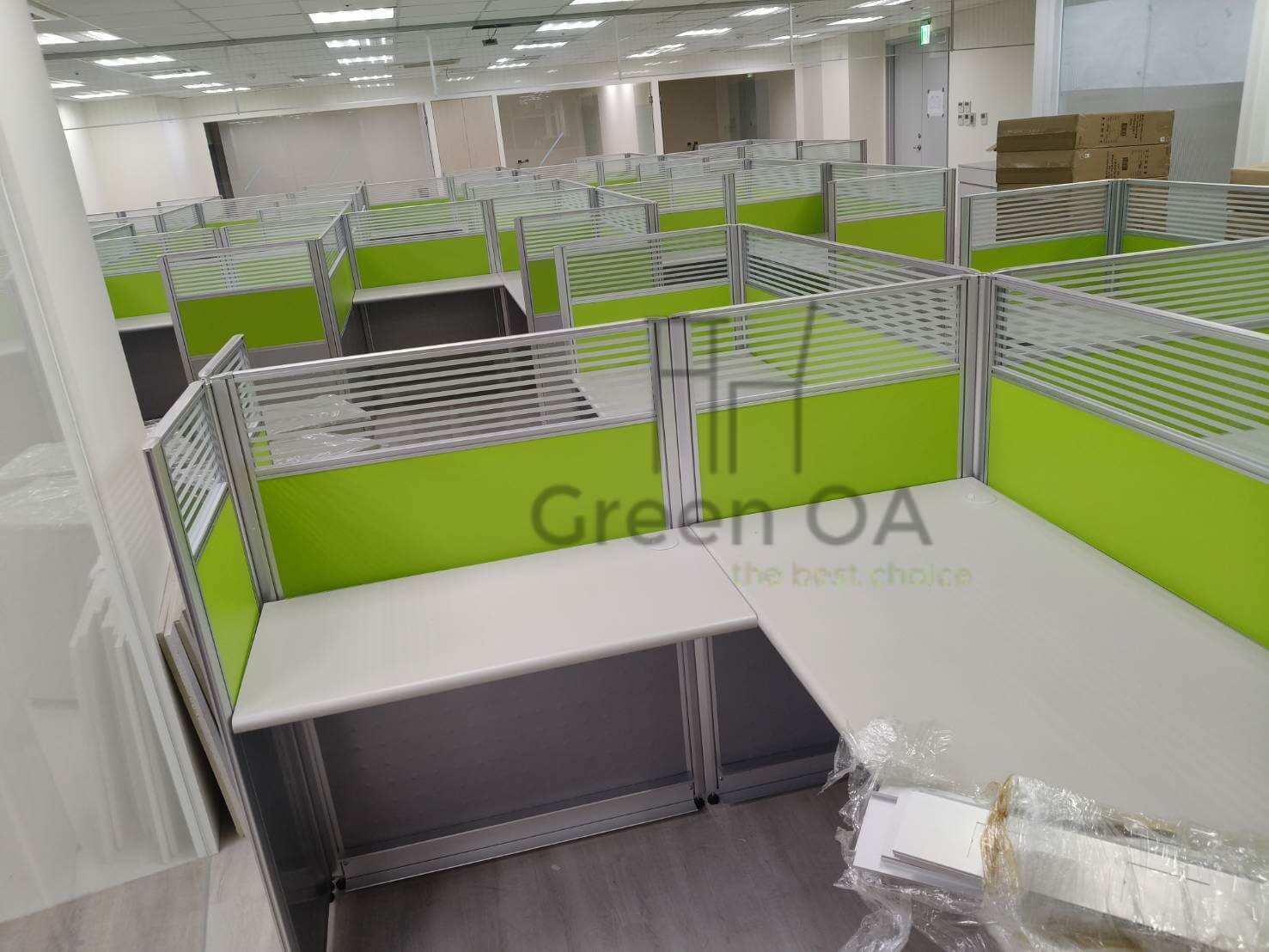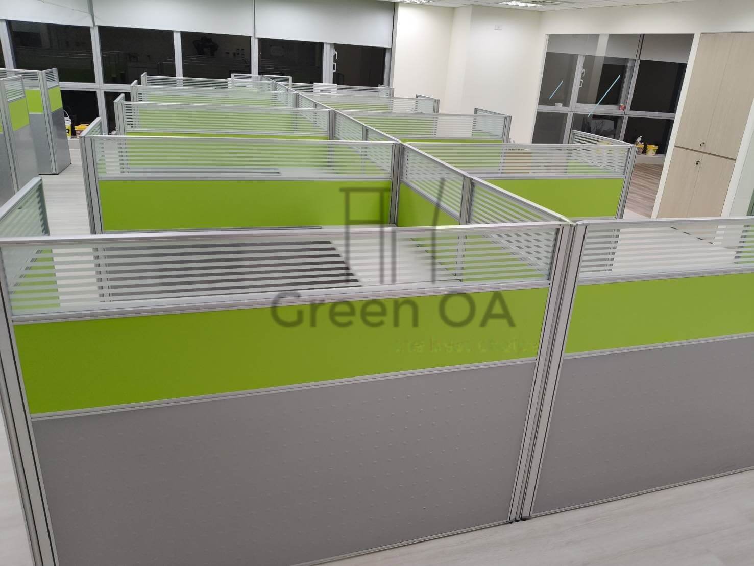 本案為客戶打造了一個充滿朝氣且功能齊全的辦公場域。GREEN OA 選用 2.5 系列屏風(121公分高),此高度能在坐姿時提供充足的心理安定感,上方結合橫紋噴砂玻璃,確保了光線的通透與空間的延伸,避免壓迫感。屏風中間層鑲嵌的亮草綠色板材,更為辦公室注入了清新活力的企業形象。