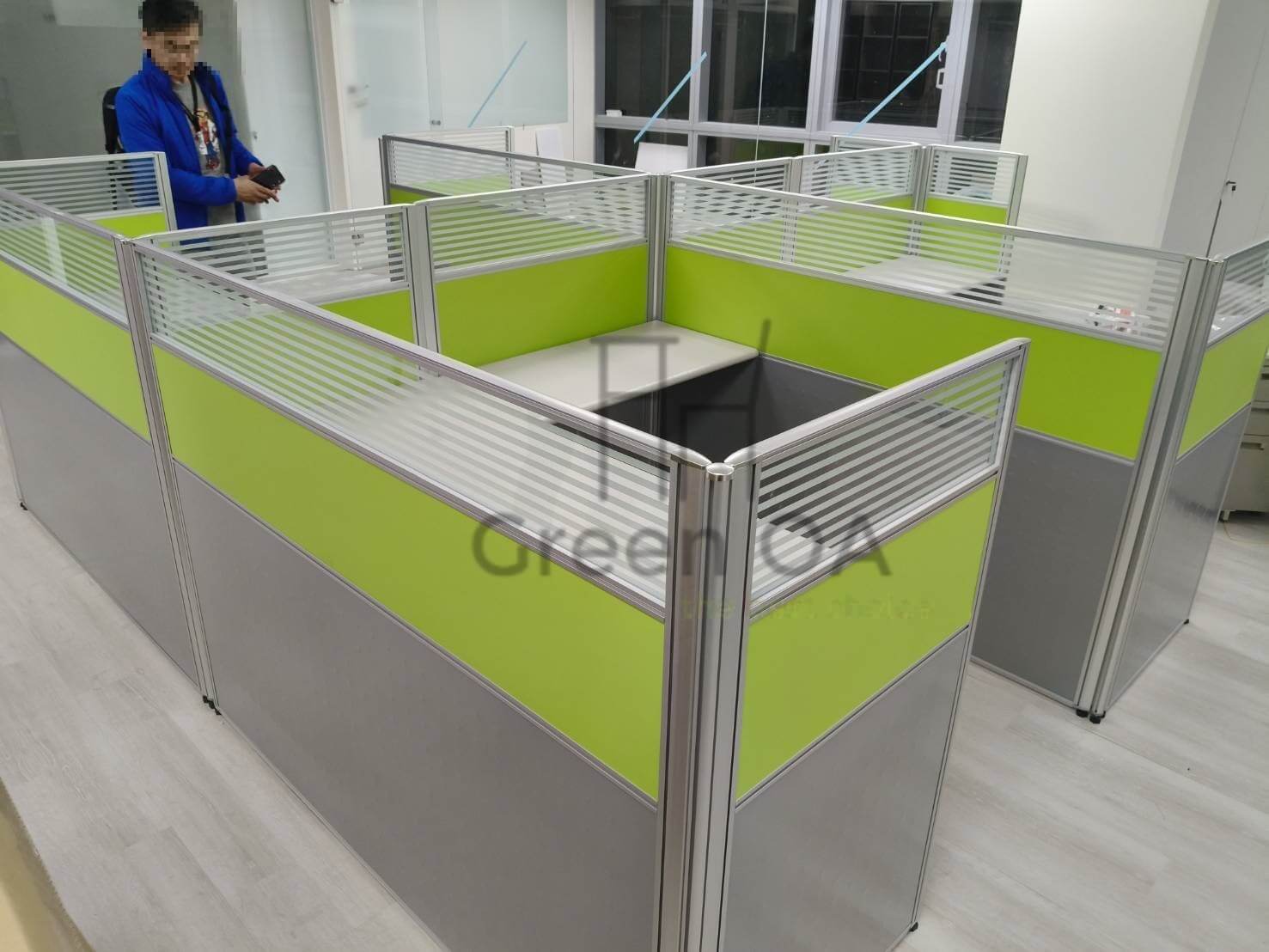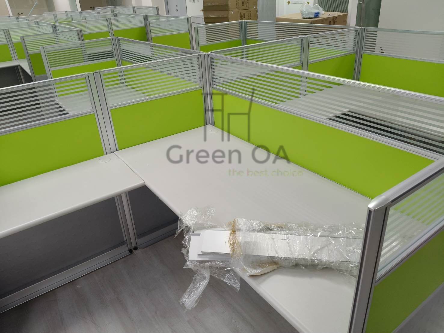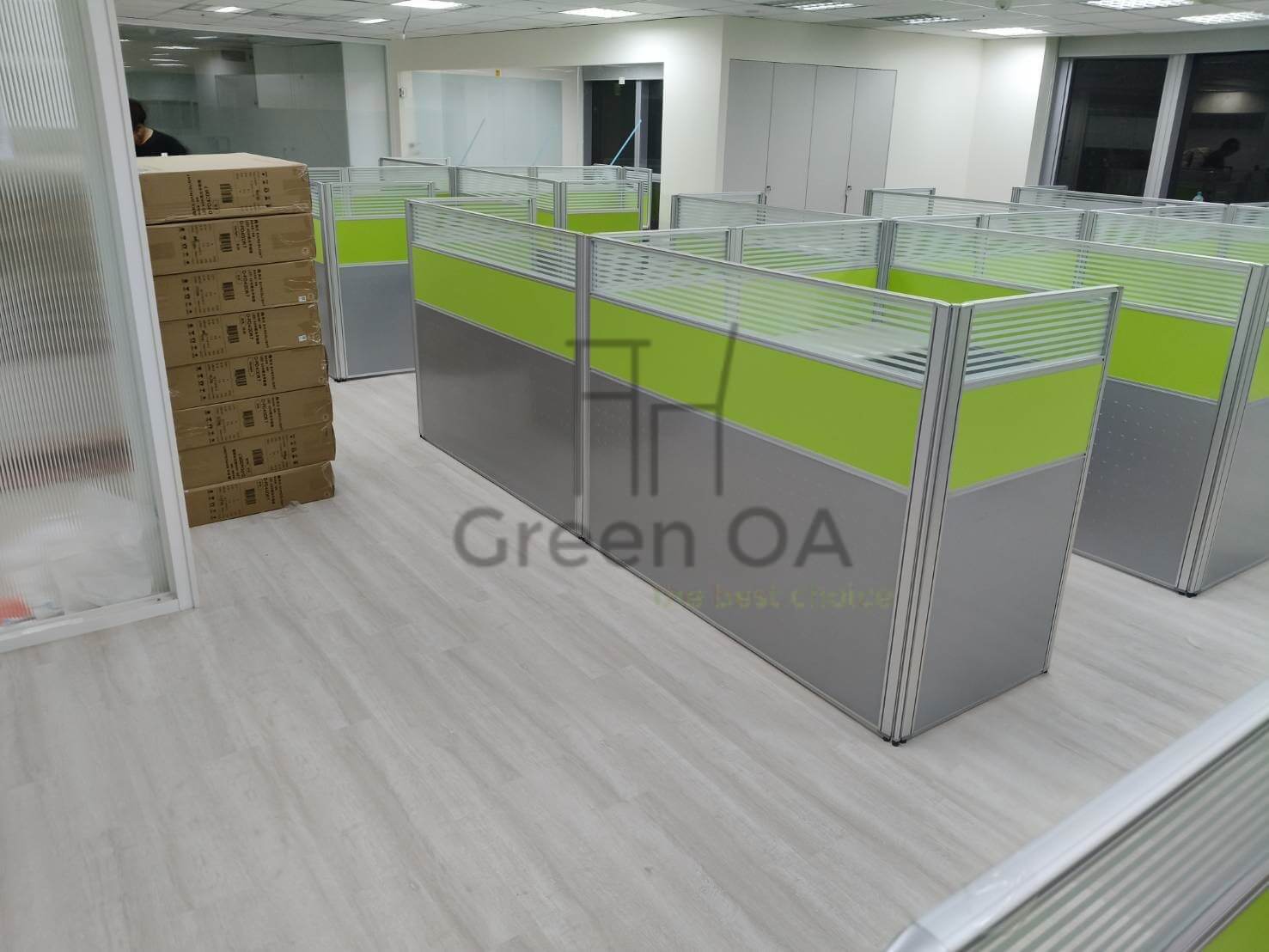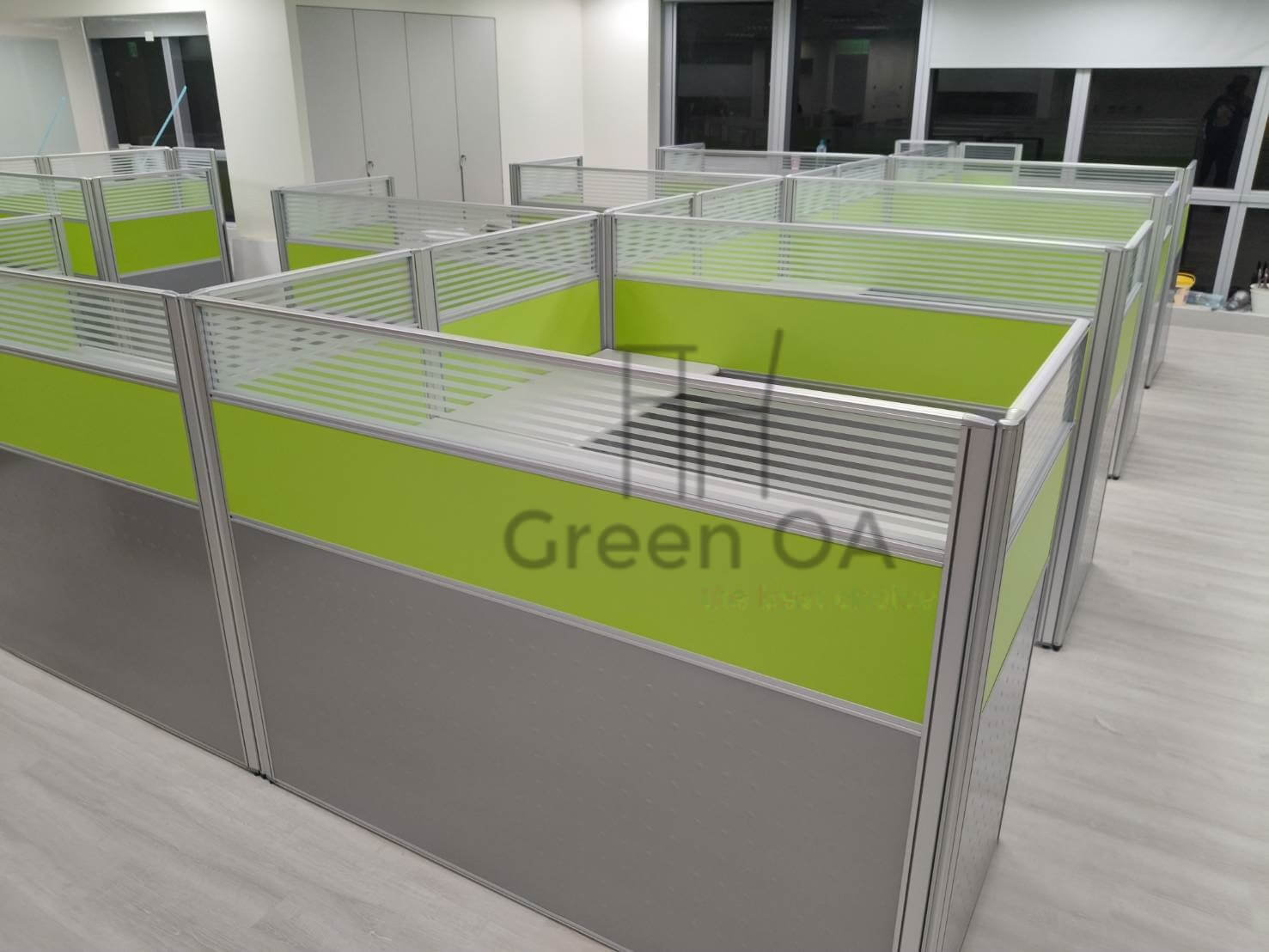 本案為客戶打造了一個充滿朝氣且功能齊全的辦公場域。GREEN OA 選用 2.5 系列屏風(121公分高),此高度能在坐姿時提供充足的心理安定感,上方結合橫紋噴砂玻璃,確保了光線的通透與空間的延伸,避免壓迫感。屏風中間層鑲嵌的亮草綠色板材,更為辦公室注入了清新活力的企業形象。
