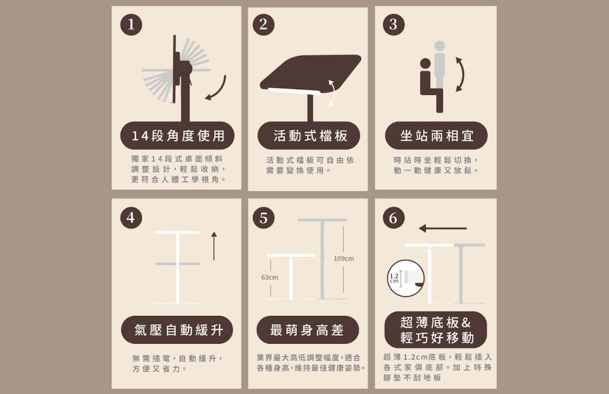 獨家14段式桌面傾斜調整設計,輕鬆收納,夠符合人體工學視角